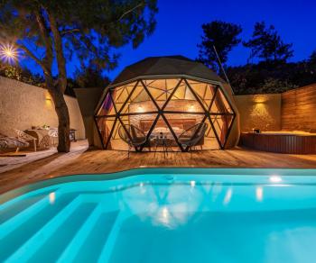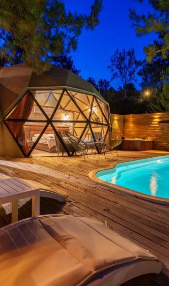 Her biri ayrı bir havuz terasına sahip olan kubbe tipi villalarımız, Türkiye'de ilk defa 7 metre çapında, 4.30 metre kubbe yüksekliğinde ve 38 metrekarelik AHŞAP yapısıyla üretilmiştir. Konforlu bir konaklama sağlamak amacıyla binalarımız, güvenlik ve iklim endişelerini göz önünde bulundurularak tasarlanmıştır.