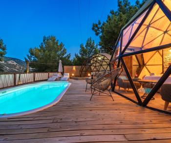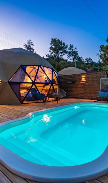Ayrı ayrı havuz teraslarına sahip olan kubbe tipi villalarımız, glamping kültürü ile çoğalan çadır konseptlerine nazaran Türkiye’de ilk olarak 7 mt çapında ve 4,30 kubbe yüksekliği ile 38 m2 olarak AHŞAP olarak imal edilmiştir. Binalarımızda güvenlik ve iklim endişesi olmadan rahatlıkla kalabilirsiniz.