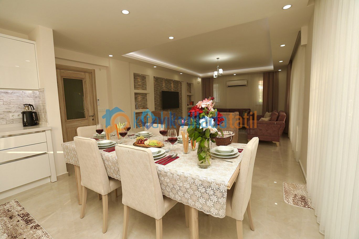 Villamızın 5 tane yatak odası olup 3 adet çift kişilik yatak ve 4 adet tek kişilik yatak bulunmaktadır. Villamız modern American mutfak olup içerisinde ihtiyacınız olabilecek 10 kişilik yemek masası ve sandalyesi, klima, bulaşık makinesi, buzdolabı, ankastre fırın, ocak ve davlumbaz, mikrodalga fırın, su Isıtıcısı, tost makinesi, çaydanlık, Türk kahve makinesi, tencere ve tava Takımı, Yemek Takımı, Kaşık çatal bıçak takımı, alkollü alkolsüz içecek bardak takımı, su sebili vb. her şey mevcuttur.