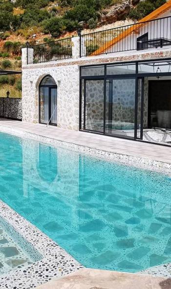 Kaynak taşı ve deniz taşları ile döşeli havuzumuz doğal bir görünüme sahip olup sizlere adeta bir gölde yüzüyormuşsunuz hissi verecektir.Villamızın içinde ayrıca hidromasaj sistemli küçük bir kapalı havuz da mevcuttur. 4 mt x 3 mt ebatlarındaki bu havuz sizlere kış ve güz dönemlerinde de tatil imkanı tanıyacaktır. Bu havuza ısıtma takılı olup, günlük 1000 TL ekstra ücrete tabii olacaktır. Havuz ısıstma sistemi hava şartlarına göre 24 ile 29 derece arasında maksimum ısı sağlamaktadır.Villamız içinde ihtiyacınız olan tüm mobilya mutfak araç gereçleri vs herşey vardır.Ayrıca dışarıdan görünürlüğü engellendiğinden dolayı muhafazakar ailelerimiz ve balayı çiftlerimiz içinde uygun seçenekte olan bi villadır.