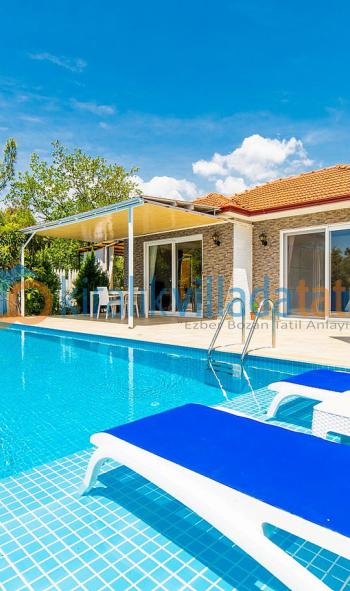 Tek yatak odası ile balayı tatili düşünen yeni evli çiftlerimize uygun olan villamızın havuz terası doğal yeşilliklerle kaplı olup etraftan görünmemektedir. Tatiliniz boyunca ihtiyacınız olacak tüm ev gereçlerinin bulunduğu villamızda kendi evinizin konforunda unutulmaz bir tatil sizi beklemektedir. Geniz havuzu ve sığ havuzu sayesinde su içerisinde güneşlenmenin keyfine varacaksınız.