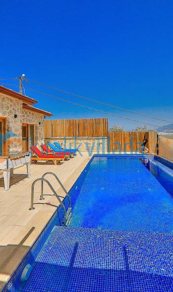 Özel havuzlu villamızın havuz terası dışarıdan görünmeyecek şekilde dekore edilmiş, muhafazakar villa seçeneklerimiz arasındadır.