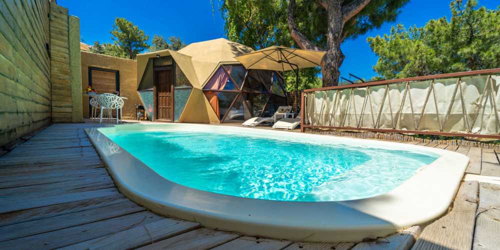 Bu konsepti farklı kılan en önemli detay glamping kültürünü yalnızca çadır hissiyle değil gerçek anlamda mimari ve konforla birleştirmesidir. kubbe villalarımız Türkiyede ilk kez 7 metre çapında, 4.30 metre kubbe yüksekliğinde ve 38 m ahşap yapıda üretilmiştir. doğanın içinde yer almasına rağmen güvenlik ve iklim kaygısı olmadan konforlu bir konaklama sağlayacak şekilde planlanmıştır. üstelik her villanın kendine ait ayrı havuz terası olması tatilinizi tamamen size özel kılar.