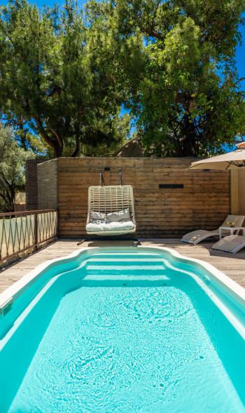 Villalarımızın dış mekanında, 6x3 metre boyutlarında ve 1.35 metre derinliğinde özel bir yüzme havuzu bulunmaktadır. Basamaklı girişi ve hidromasajlı jakuzisi ile birlikte keyifli bir havuz deneyimi sunmaktadır. Ayrıca, her villada iki adet şezlong, şemsiye, salıncak, geniş yemek masası, 2 sandalye ve yumurta tipi oturma grubu standart olarak sunulmaktadır. (No1 hariç, hepsinde 2 kişilik yumurta tipi oturma grubu ve sehpası bulunmaktadır. No5 özel bir gölgelik geodesik kamelya ve bu kamelyada 2 adet ekstra ahşap şezlong içermektedir.)