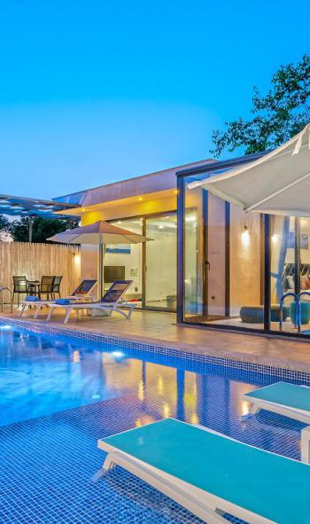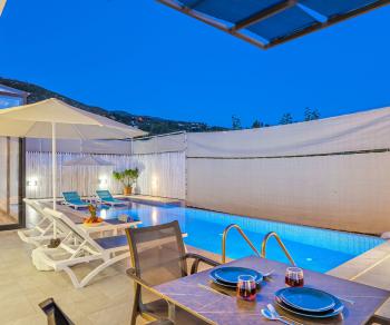 Oldukça lüks ve zevkli bir şekilde döşenen villamız doğa manzaralı olup, sessiz sakin bir bölgede kafa dinlemek isteyen konuklarımız için ideal bir villadır. Villamız iki odadan oluşmakta olup, ana girişte açık plan bir mutfak oturma odası mevcuttur, ana yatak odasında ise büyük ebat bir jakuzi ve kapalı havuz ve ana havuz terasına çıkış vardır. Oturma odasındaki geniş oturma grubu tek çocuklu aileler için yatak olarak kullanılabilir. Villamızın dış çevresi yüksek çitler ile görünürlüğü koruma altına alınmış olup dileyen konuklarımız için havuz önünde çift kademeli perde sistemi ile muhafazakar hale gelir.