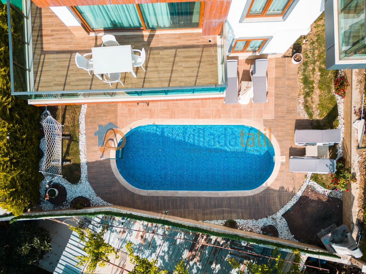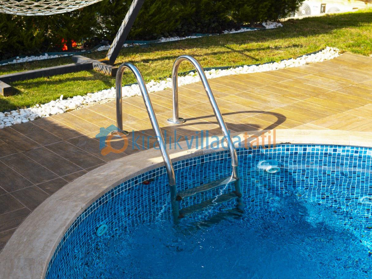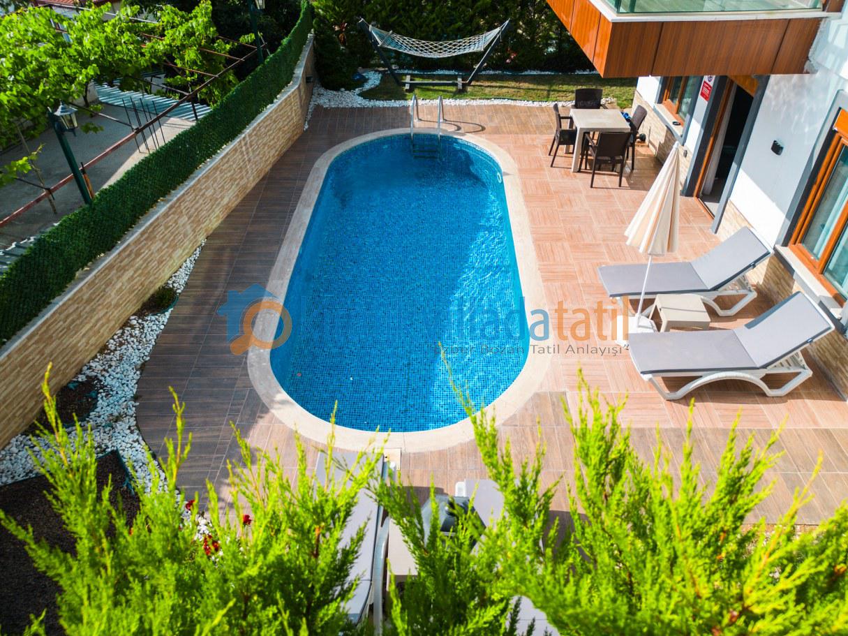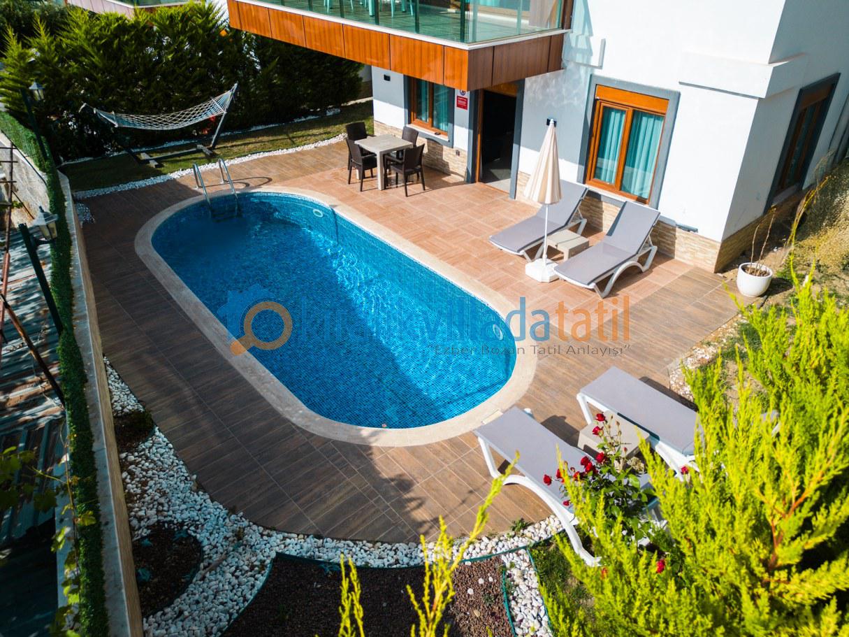 Villanın özel havuz alanı, tamamen doğa içinde ve dış gözlerden uzak olacak şekilde tasarlanmıştır. Bu özelliğiyle, muhafazakâr aileler ve balayı çiftleri için güvenli, huzurlu ve keyifli bir konaklama imkânı sunar.