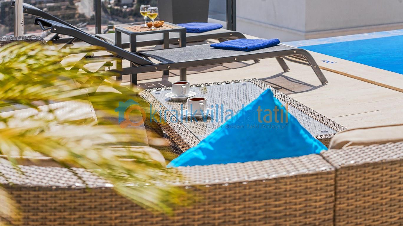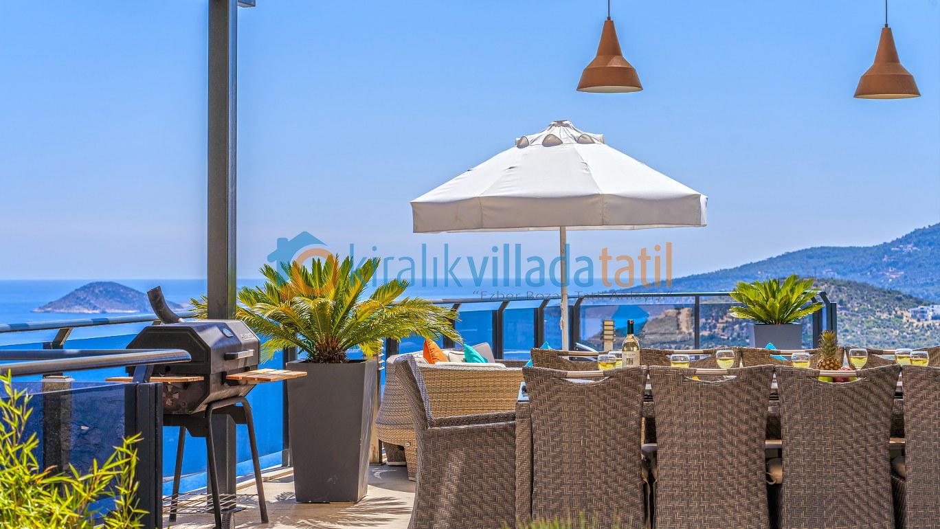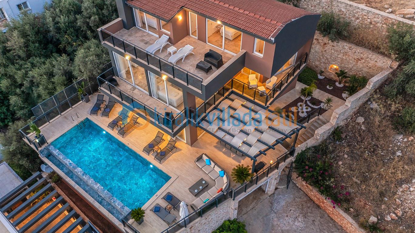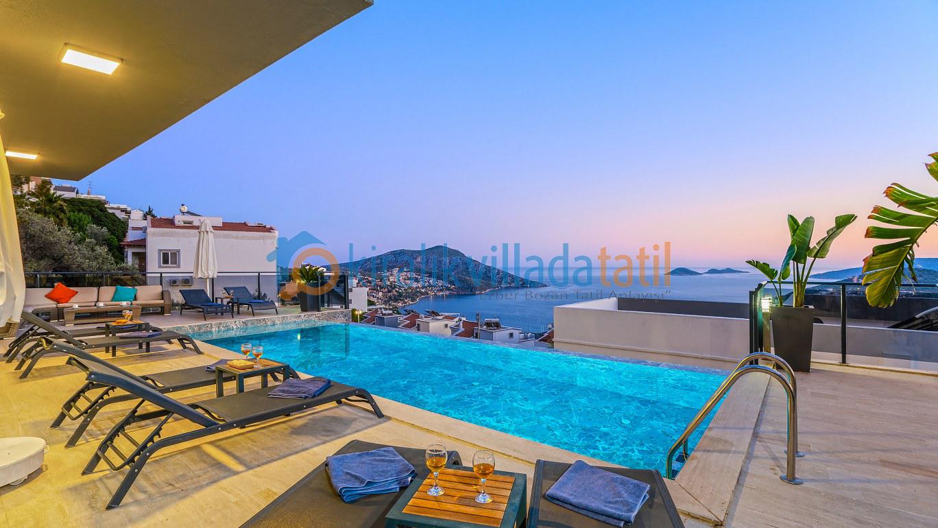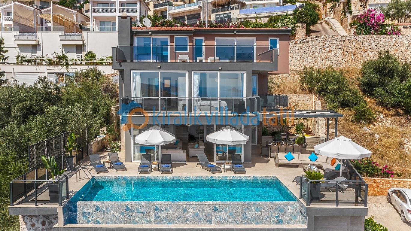 Bu ilan ait Detaylı açıklama ve bilinmesi gereken detaylarYaz tatilinin vazgeçilmez noktalarından biri olan kesintisiz deniz manzarası ve doğasıyla tatil severleri cezbeden Kalkan beldesinin Kızıltaş mevkiinde konumlanmıştır. Muhteşem deniz manzarasının yanında sade ve şık tasarımıyla da dikkat çeken Villamız, beş yatak odasıyla on kişilik konaklama kapasitesine sahiptir. Kalabalık aileler ve arkadaş grupları için son derece idealdir. Misafirlerinin her türlü konfor ihtiyacı gözetilerek dekore edilmiş olan villada ayrıca keyifli vakit geçirebilmeniz için masa tenisi, langırt ve koşu bandı gibi oyun ve spor mateyallerinin bulunduğu oyun odasına da yer verilmiştir.
