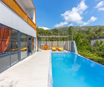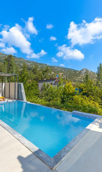 Villamızın en özel özelliklerinden biri de dışarıdan görünmeyen özel yüzme havuzudur. Havuz terası tamamen korunaklı olup, misafirlerimizin tamamen gizlilik içinde rahatça yüzebilmelerini sağlar. Bu özellik, mutaassıp aileler ve balayı çiftleri için büyük bir avantaj sunmaktadır. Havuz etrafındaki rahat oturma alanları, güneşlenme şezlongları ve dinlenme alanları, huzurlu bir ortamda tatil yapmanızı sağlar. Villanın bahçesi de oldukça geniş olup, doğa ile iç içe olmanızı sağlar. Bahçede yer alan salıncak ve hamak, doğanın içinde sakin bir akşam geçirmek isteyenler için harika bir fırsat sunmaktadır.