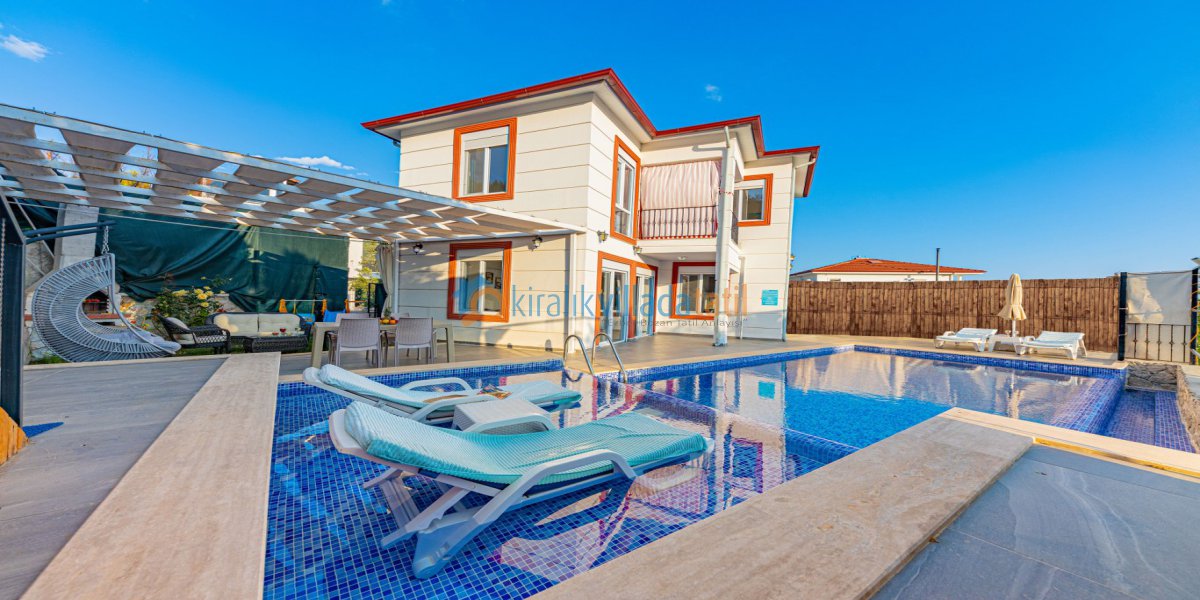 Villanın havuz ve teras alanı korunaklı yapıya sahip olup dışarıdan görünmeyen yapısı sayesinde mahremiyete önem veren misafirler için rahat bir tatil ortamı oluşturur. Özel yüzme havuzunun yanında yer alan çocuk havuzu ise ailelerin çocuklarıyla birlikte güvenle vakit geçirebileceği keyifli bir alan sunmaktadır.