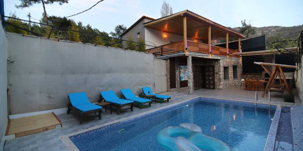 Villamızın en önemli özelliklerinden biri de korunaklı yüzme havuzudur. Dışarıdan görünmeyen özel havuz muhafazakar tatil arayan misafirlerimiz için büyük bir avantaj sunmaktadır. Havuz başında güneşlenme alanları, oturma grupları ve rahat dinlenme alanları tatilinizin her anını keyifli hale getirecektir. Ayrıca havuzun etrafındaki geniş bahçe doğayla iç içe bir atmosfer sunarak misafirlerine dinlenme ve rahatlama imkanı sağlar.