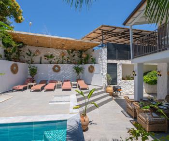 Doğa ile çevrili olan bu villa, sabahları kuş sesleri eşliğinde uyanmak ve akşamları havuz terasında sevdiklerinizle keyifli anlar geçirmek için ideal bir ortam sunmaktadır. Havuz başında yer alan şezlonglar ve oturma alanları, gün boyu güneşin tadını çıkarabileceğiniz rahat bir atmosfer yaratır.