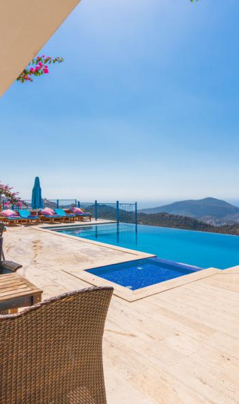 Villanın dış mekanında, sadece size özel olan geniş bir yüzme havuzu bulunmaktadır. Havuz kenarındaki rahat oturma alanları, güneşlenme alanları ve şezlonglarla donatılmış geniş bir teras, tatilinizi daha da keyifli hale getirecek. Güneşin batışını izlerken ya da sabahları deniz manzarası eşliğinde kahvaltı yaparken unutulmaz anlar yaşayabilirsiniz. Ayrıca villamızın terasında, akşam yemeklerinizi keyifle yiyebileceğiniz bir alan da mevcuttur.