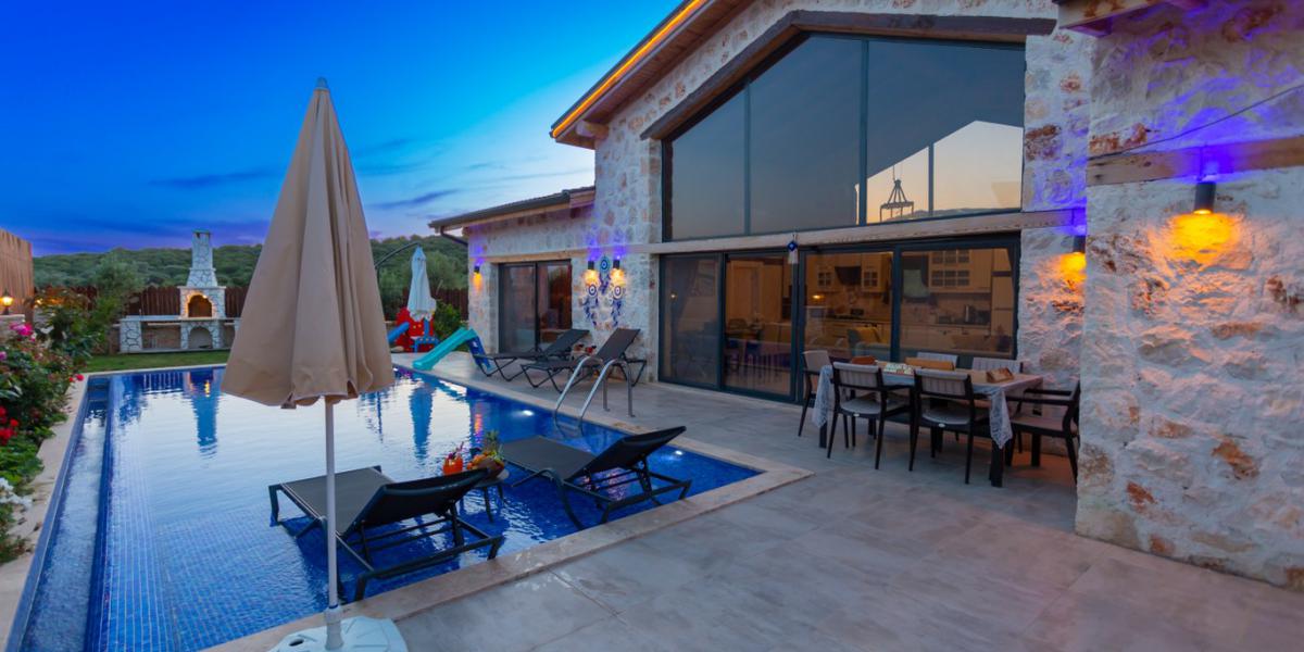 Bahçe: Doğa manzaralı bahçede özel yüzme havuzu, şezlonglar, güneş şemsiyesi, bahçe köşe takımı, bahçe yemek masası, salıncak, oyun parkı ve barbekü bulunmaktadır. Önemli Bilgiler: Villamızda ücretsiz olarak sunulan hizmetler; günlük temizlik hizmeti, havuz ve bahçe kullanımı, ücretsiz Wi-Fi, otopark, elektrik, su ve gazdır. Kiralık araç, ekstra temizlik, temiz havlu ve çarşaf gibi ihtiyaçlar villa kiralama ücretine dahil değildir.