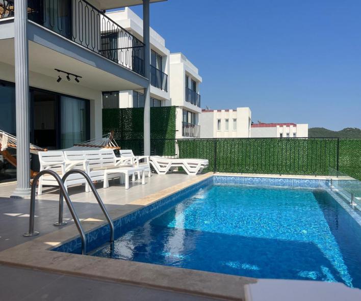 Villamız dış yaşam alanı, tatilinizi daha keyifli hale getirecek şekilde planlanmıştır. Özel yüzme havuzu, gün boyu serinlemeniz için ideal bir alan sunarken; havuz terasında yer alan şezlonglar ve oturma alanları, doğanın tadını çıkarabileceğiniz keyifli bir ortam oluşturur. Bu alanlarda sevdiklerinizle birlikte dinlenebilir, güneşin ve doğanın keyfini çıkarabilirsiniz. Doğa ile iç içe konumu sayesinde Villamız, şehir hayatının yoğunluğundan uzaklaşmak isteyen misafirler için oldukça uygun bir seçenektir. Kaş merkezine kolay ulaşım imkânı sunan villamız, hem sakin bir tatil geçirmek hem de bölgenin doğal ve turistik güzelliklerini keşfetmek isteyen misafirler için avantajlı bir konaklama imkânı sağlar.