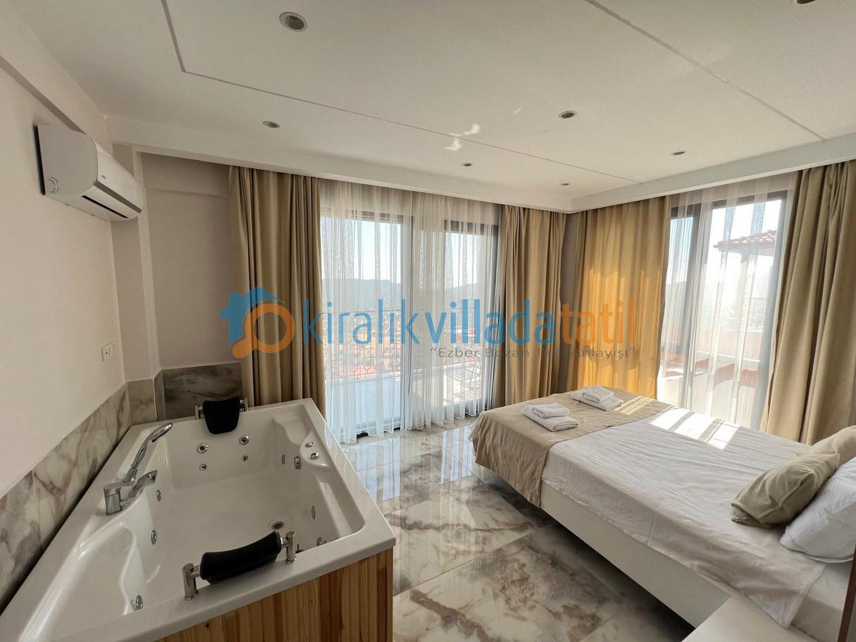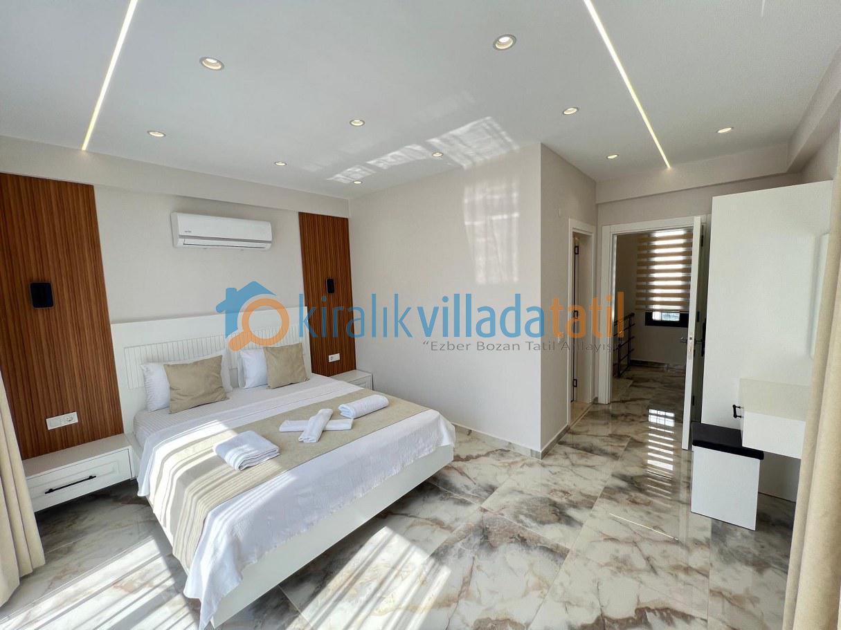 Villamızın tüm yaşam alanları, konfor ve estetik ön planda tutularak özenle tasarlanmıştır. Ferah iç mekânlar, modern mobilyalar ve kaliteli detaylarla donatılan Villmız misafirlerine ev rahatlığında bir tatil deneyimi sunar. Açık plan salon ve mutfak alanı, gün boyu keyifli vakit geçirebileceğiniz geniş ve kullanışlı bir alan sağlar. Mutfak bölümünde tatil süresince ihtiyaç duyabileceğiniz tüm mutfak araç-gereçleri eksiksiz şekilde yer almaktadır. Yatak odaları rahatlık ve huzur düşünülerek dizayn edilmiş olup, misafirlerin dinlenme ihtiyaçlarını en iyi şekilde karşılayacak konfora sahiptir.
