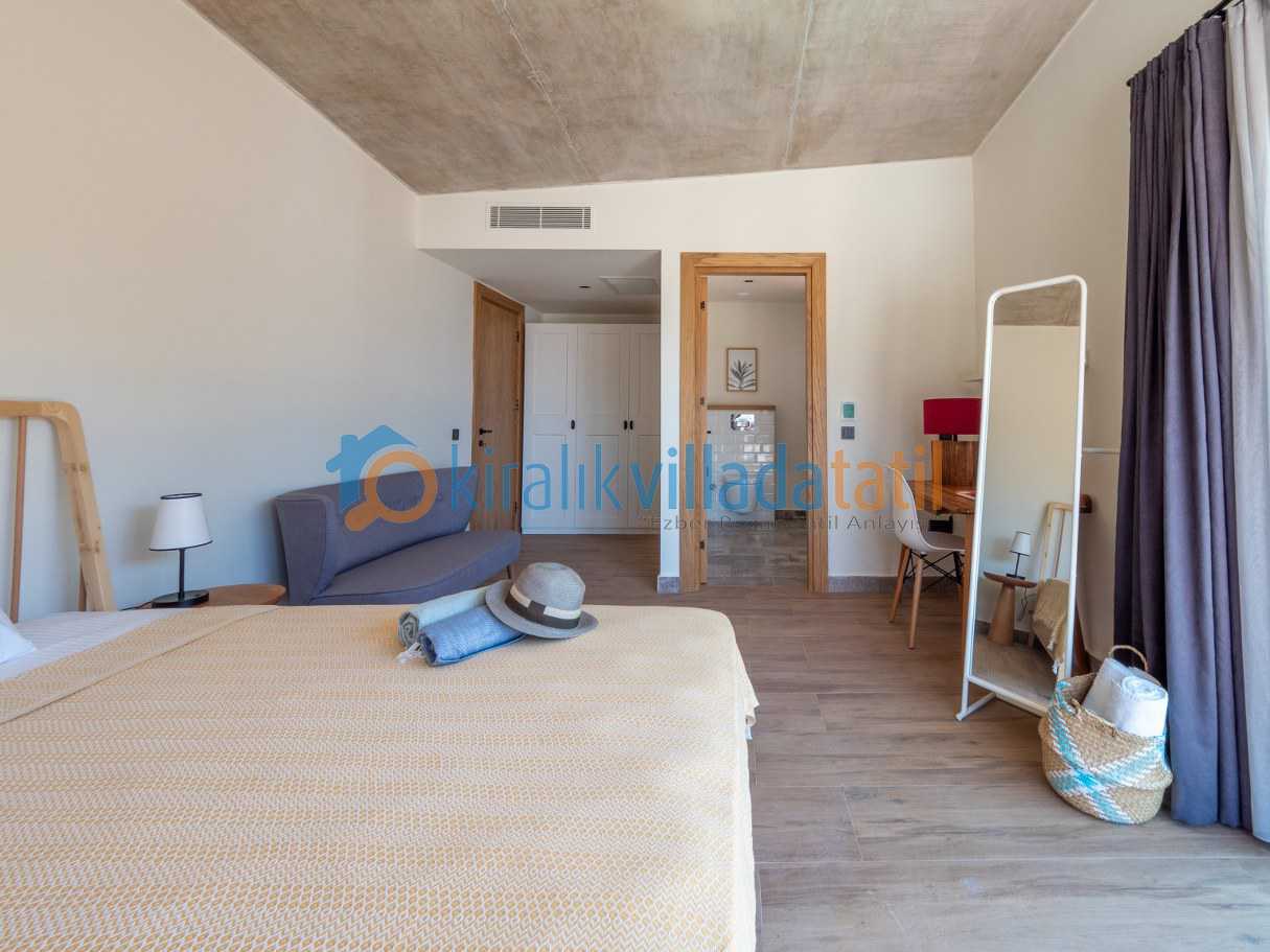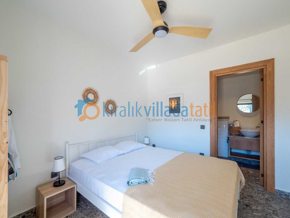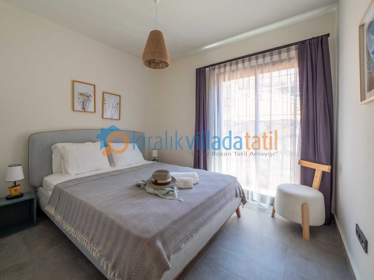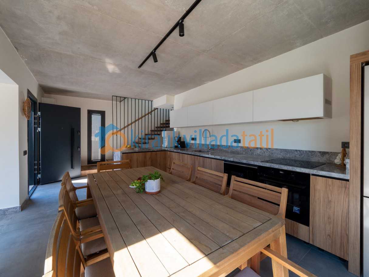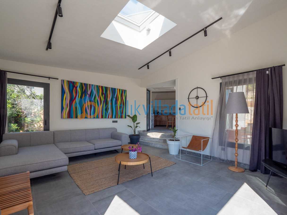 Ferah ve aydınlık salonu, şık detaylarla donatılmış açık plan mutfağı ile birleşerek fonksiyonel ve estetik bir yaşam alanı oluşturur. Büyük cam paneller sayesinde iç mekân ile dış mekân arasında bütünlük sağlanırken, gün boyu doğal ışık alan atmosferiyle keyifli bir konaklama deneyimi sunulmaktadır.