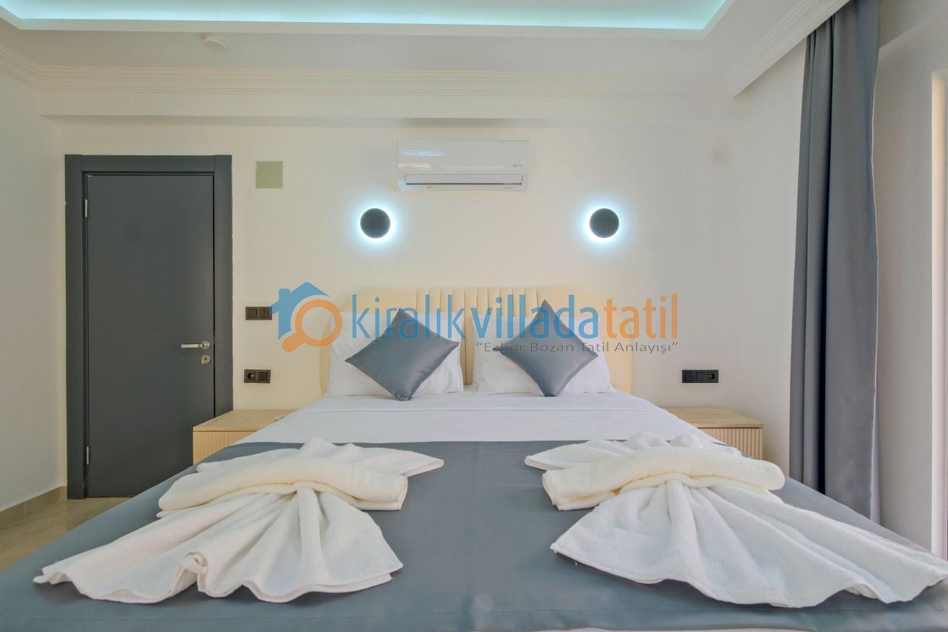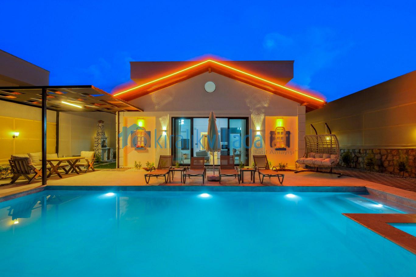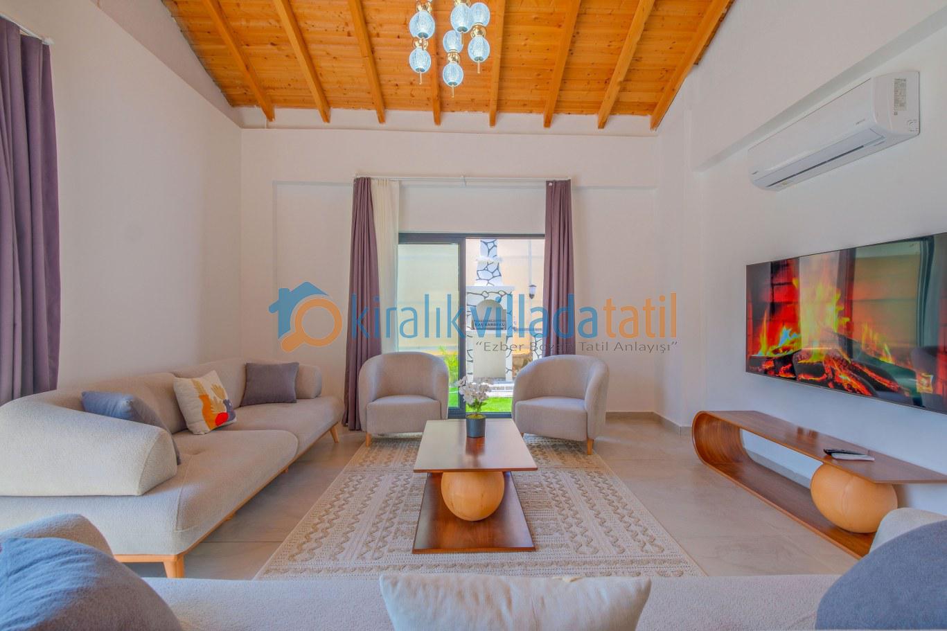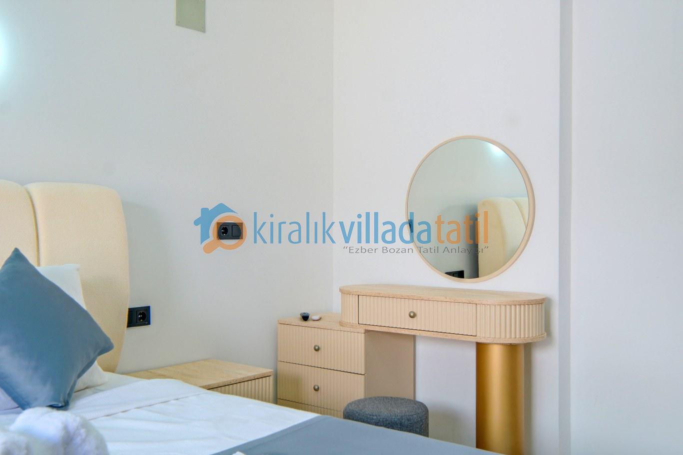 Modern ve kullanışlı detaylarla tasarlanan iç mekân; ferah bir salon, tam donanımlı mutfak, rahat yatak odaları ve ihtiyaç duyabileceğiniz tüm temel ekipmanları barındırmaktadır. Sekiz kişilik konaklama kapasitesiyle hem kısa süreli konaklamalarda hem de uzun tatil planlarında yüksek konfor sunan bu kiralık villa, ev rahatlığını tatil konseptiyle birleştirir.