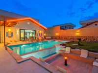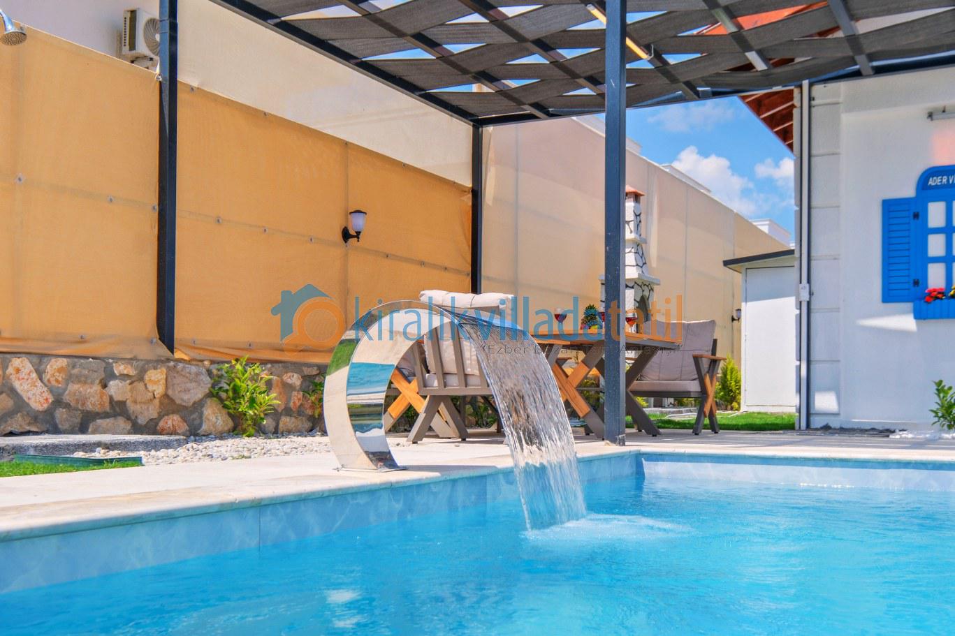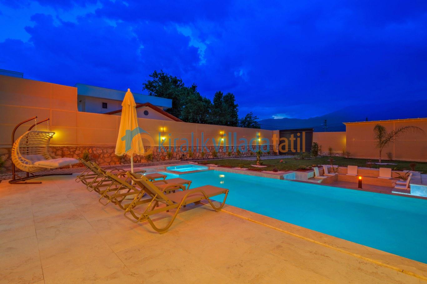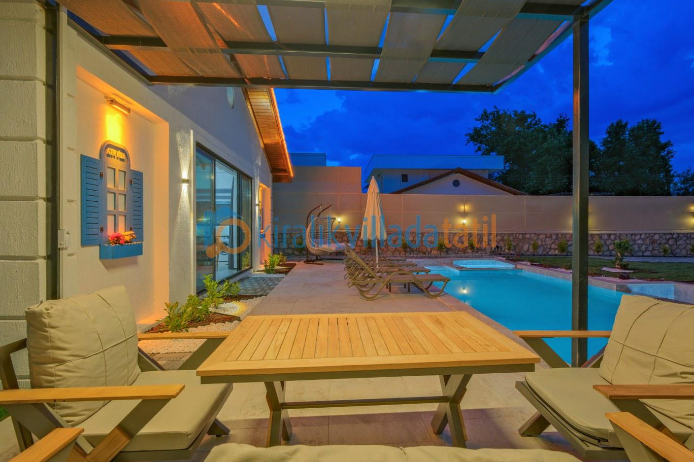 Villaya adım attığınız anda sizi karşılayan özel yüzme havuzu ve geniş peyzajlı bahçe, tatil boyunca en çok vakit geçireceğiniz alanlardan biri olacaktır. Güneşlenme terası, konforlu şezlonglar, açık hava oturma grubu ve yemek masası ile hem dinlenebilir hem de sevdiklerinizle keyifli sofralar kurabilirsiniz. Geniş yeşil alanı sayesinde çocuklu aileler için güvenli bir kullanım sunan villa, izole tatil anlayışını ön plana çıkarır.