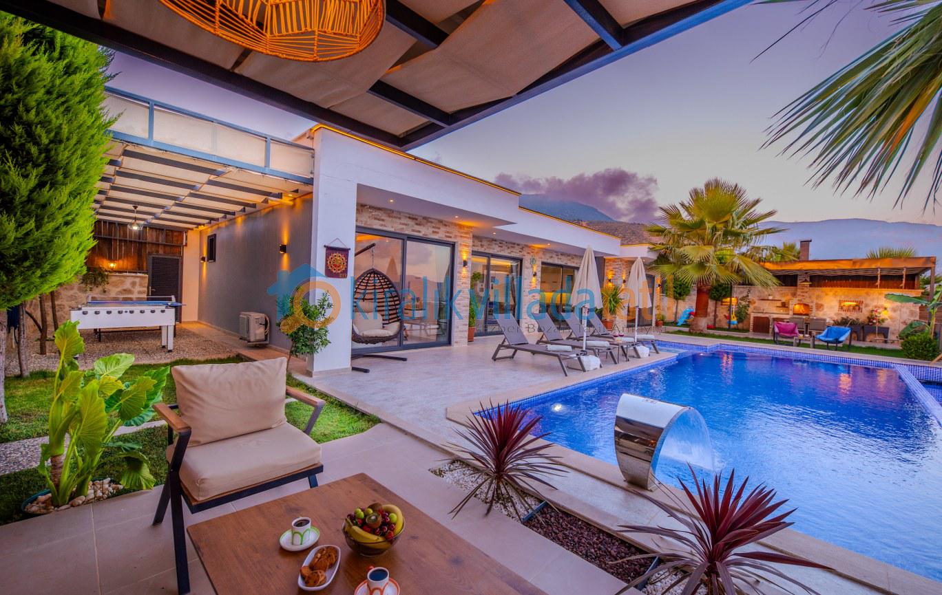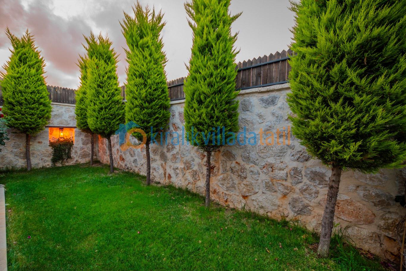 Villanın en dikkat çeken alanlarından biri, 12x4 metre ölçülerindeki geniş ve korunaklı özel havuzu. Büyük havuz terası gün boyu güneşin tadını çıkarabileceğiniz şekilde tasarlanmış. Terasta yer alan oturma grubu, salıncak, puf koltuklar ve yemek masası sayesinde hem dinlenebilir hem de sevdiklerinizle açık havada keyifli sofralar kurabilirsiniz. Mangal alanı, doğa manzarası eşliğinde akşam yemeklerini daha da özel hale getirirken, yeşillikler içerisindeki bahçe alanı kalabalıktan uzak sakin bir atmosfer sunuyor.