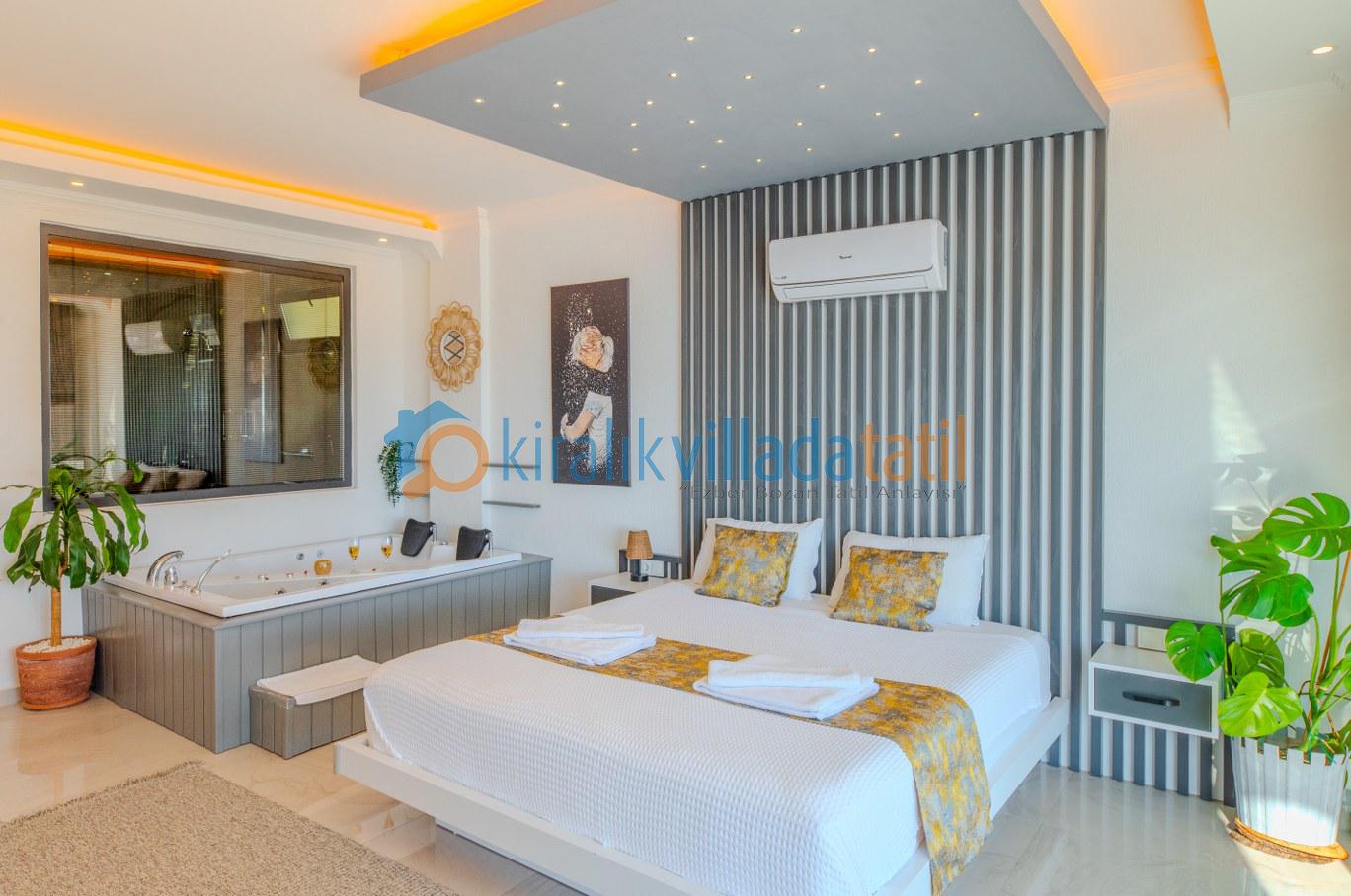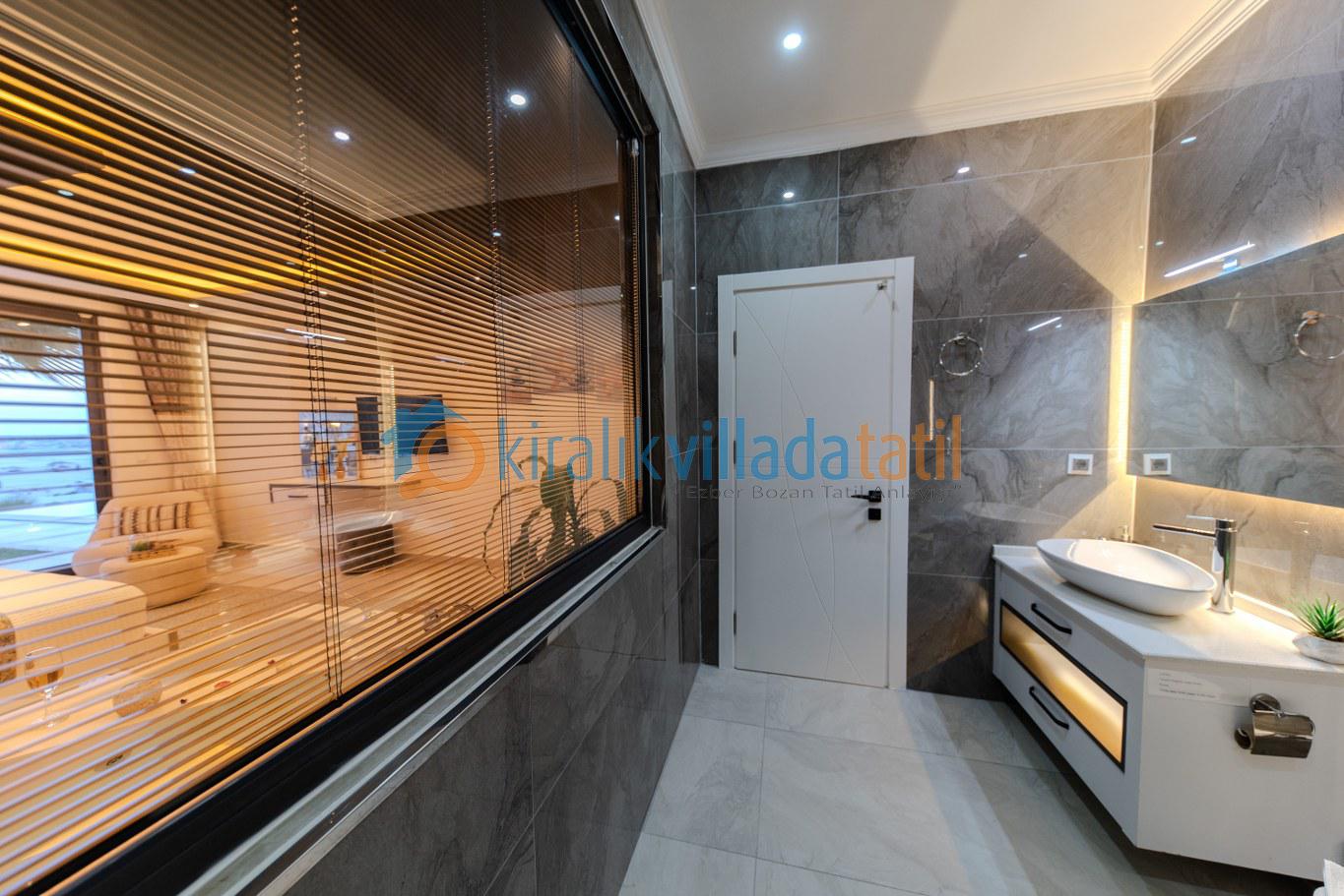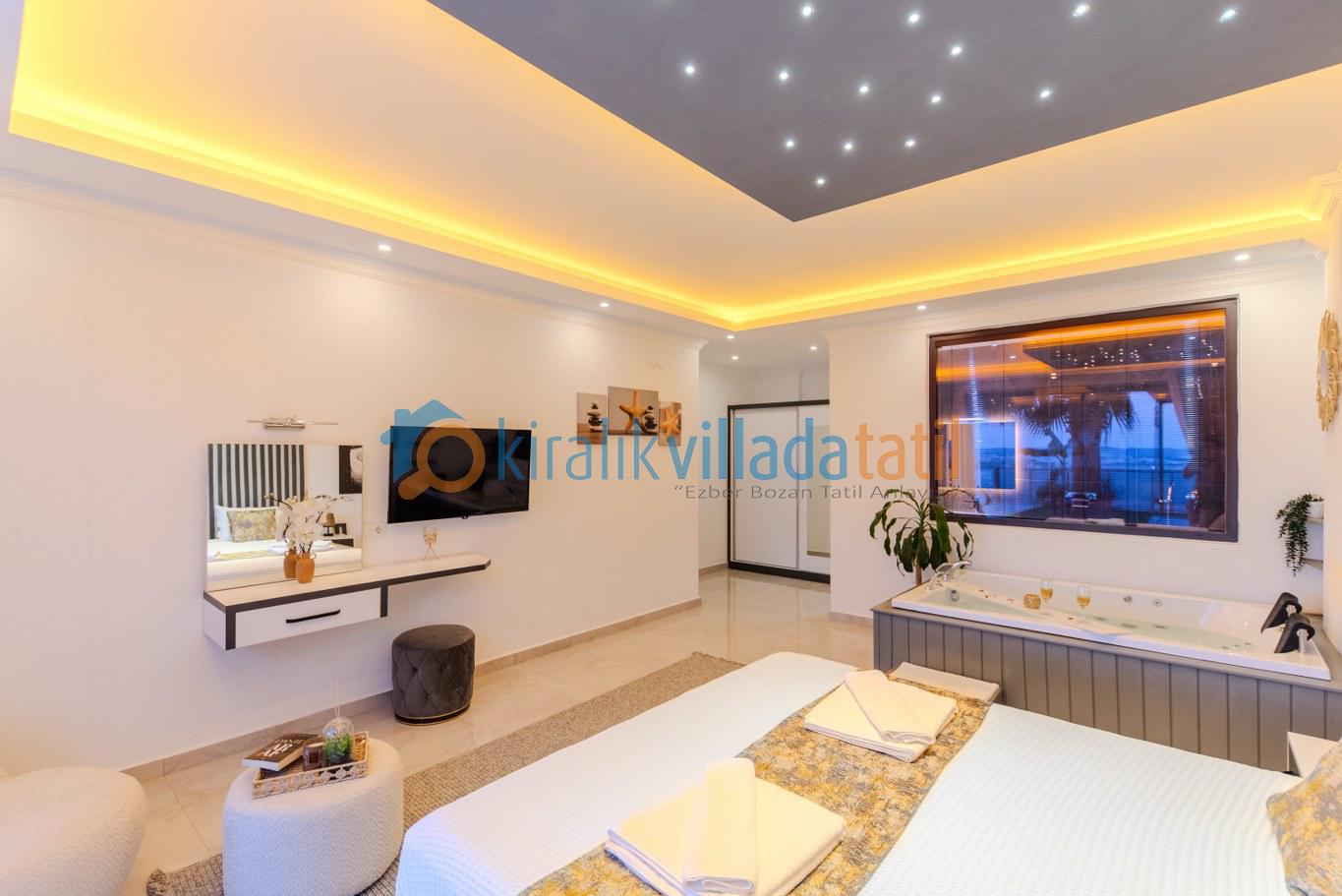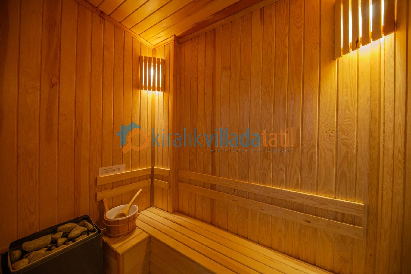 Yatak odasında bulunanjakuzi ve sauna ise villaya ekstra bir konfor katıyor. Günün yorgunluğunu jakuzide atabilir, saunada rahatlayarak tatilinize küçük bir spa dokunuşu ekleyebilirsiniz. Havuz alanının korunaklı yapısı sayesinde dışarıdan görünmeden rahatça vakit geçirebilir, özellikle muhafazakâr misafirler için güvenli ve konforlu bir kullanım elde edebilirsiniz.