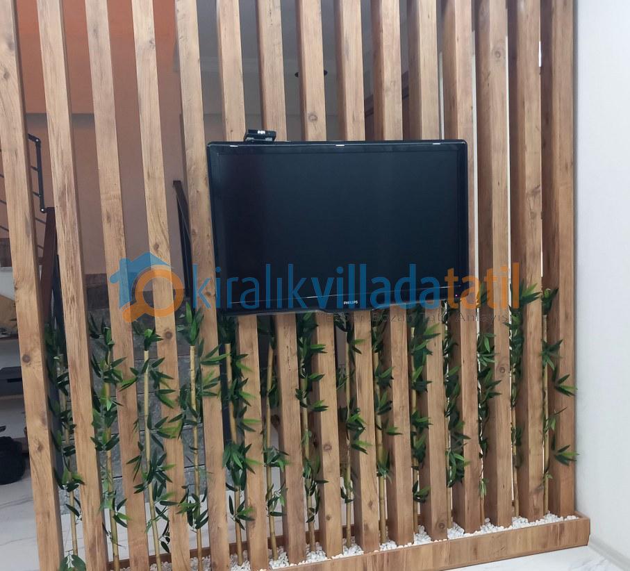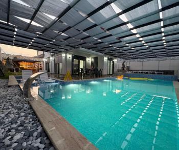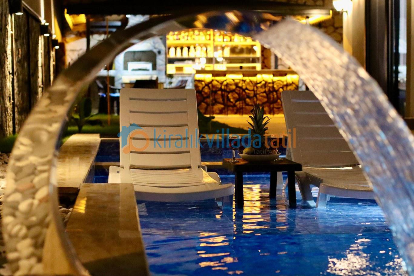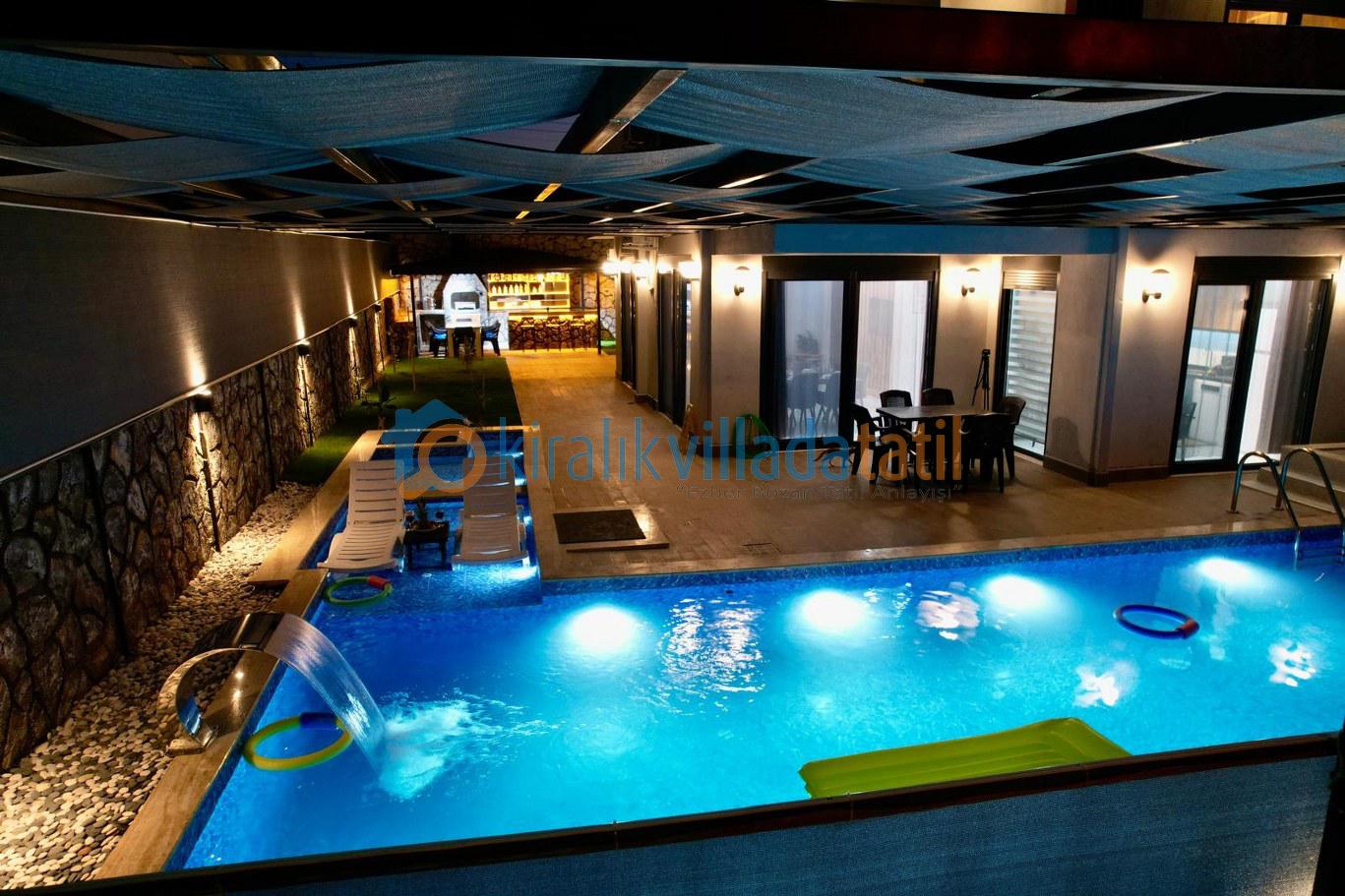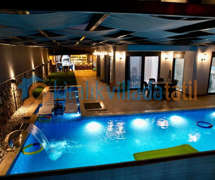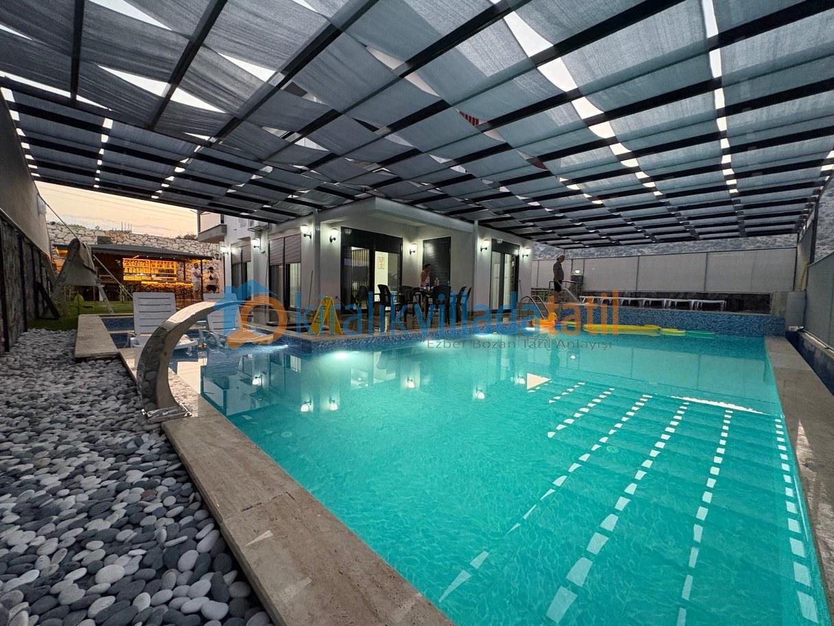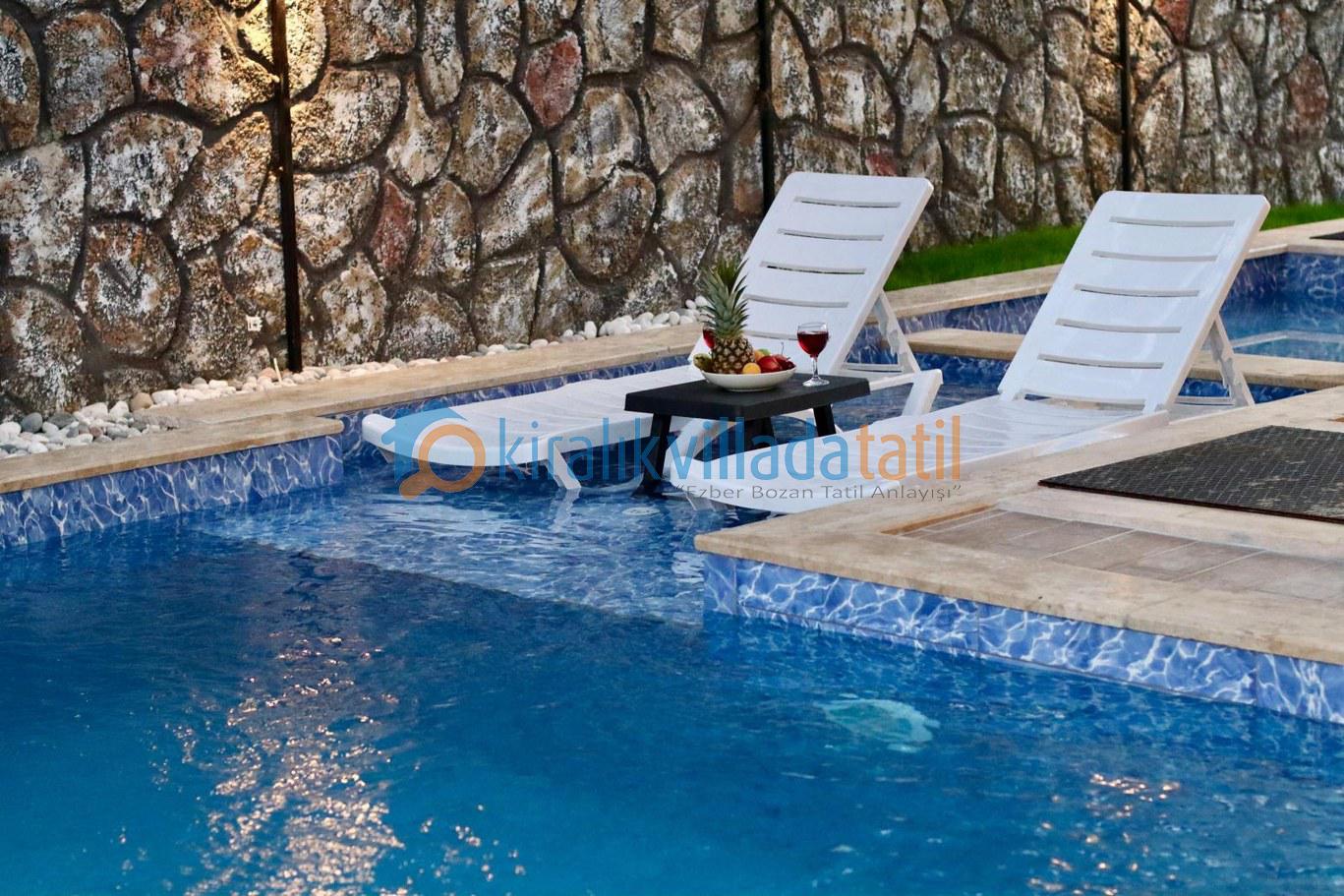 Villanın dış yaşam alanında yer alan 5.5 mx 10.5 m ölçülerindeki özel yüzme havuzu ve 1.50 mderinliği, ferah bir yüzme deneyimi sunarken; 2.20 mx 2.50 m ölçülerindeki çocuk havuzu (40 cm derinlik) ve sığ havuz bölümü sayesinde minik misafirler için güvenli bir alan oluşturulmuştur. Ayrıca villamızın dış havuzu ısıtma sistemine sahip olup, talep edilmesi durumunda günlük 1.500 TL karşılığında aktif edilmektedir. Sistemi kullanmak isteyen misafirlerimiz girişten en az 2 gün önce ilgili kişiye bilgi vermeleri gerekmektedir. Isıtma sistemi sayesinde havuz suyu sıcaklığı maksimum 22 – 29 derece aralığında tutulabilmekte olup, bu değerler mevsimsel hava koşullarına bağlı olarak değişkenlik gösterebilmektedir.