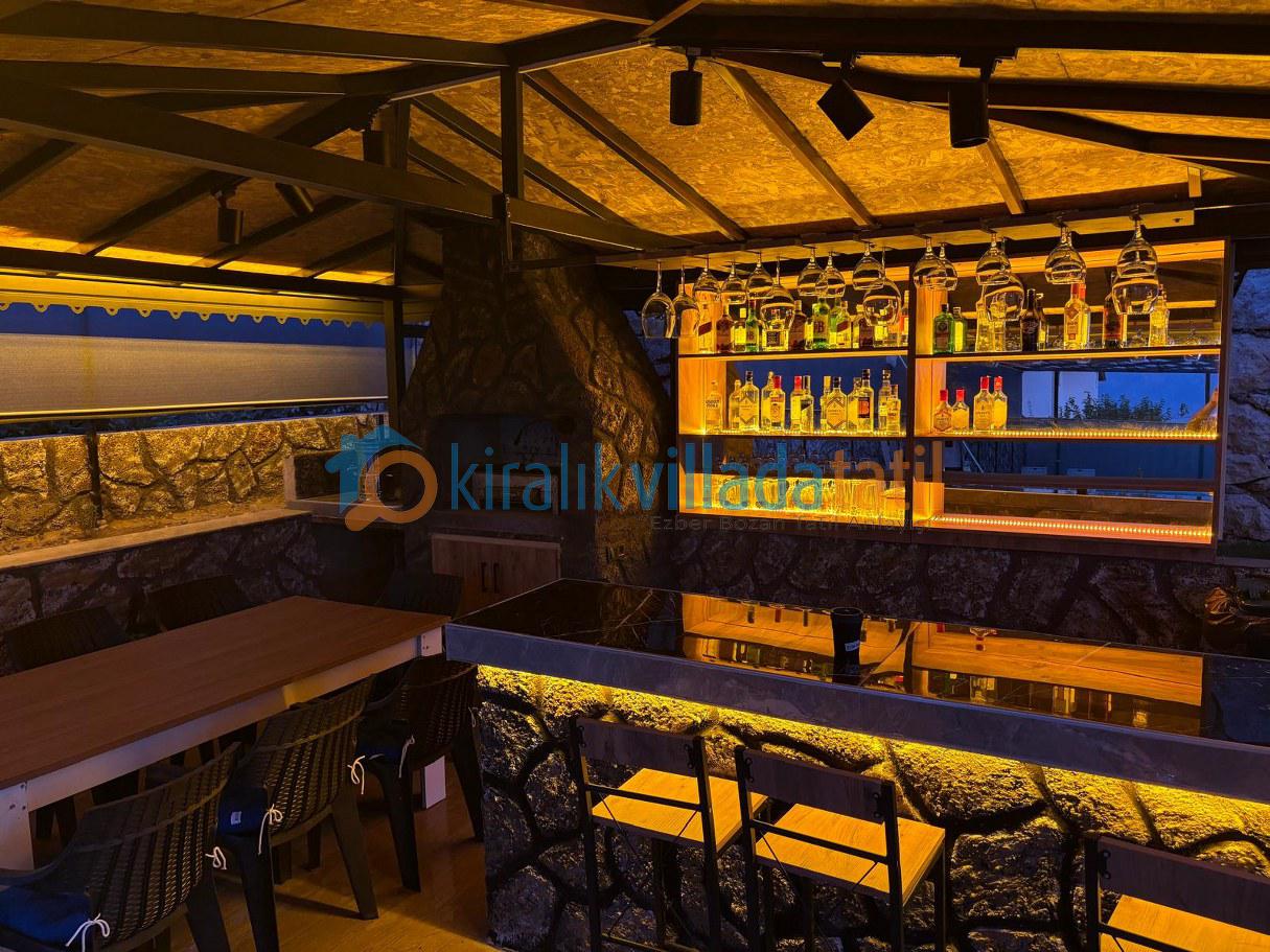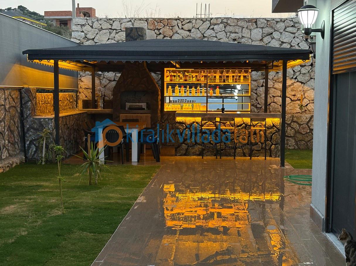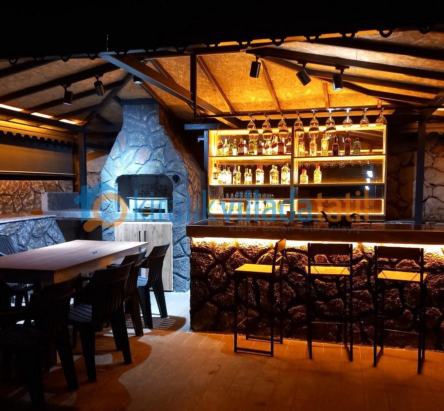 Geniş çim bahçe, barbekü alanı, bar bölümü, semaver köşesi ve hem veranda hem de bahçede bulunan 8 kişilik yemek masaları ile açık havada keyifli sofralar kurabilirsiniz.