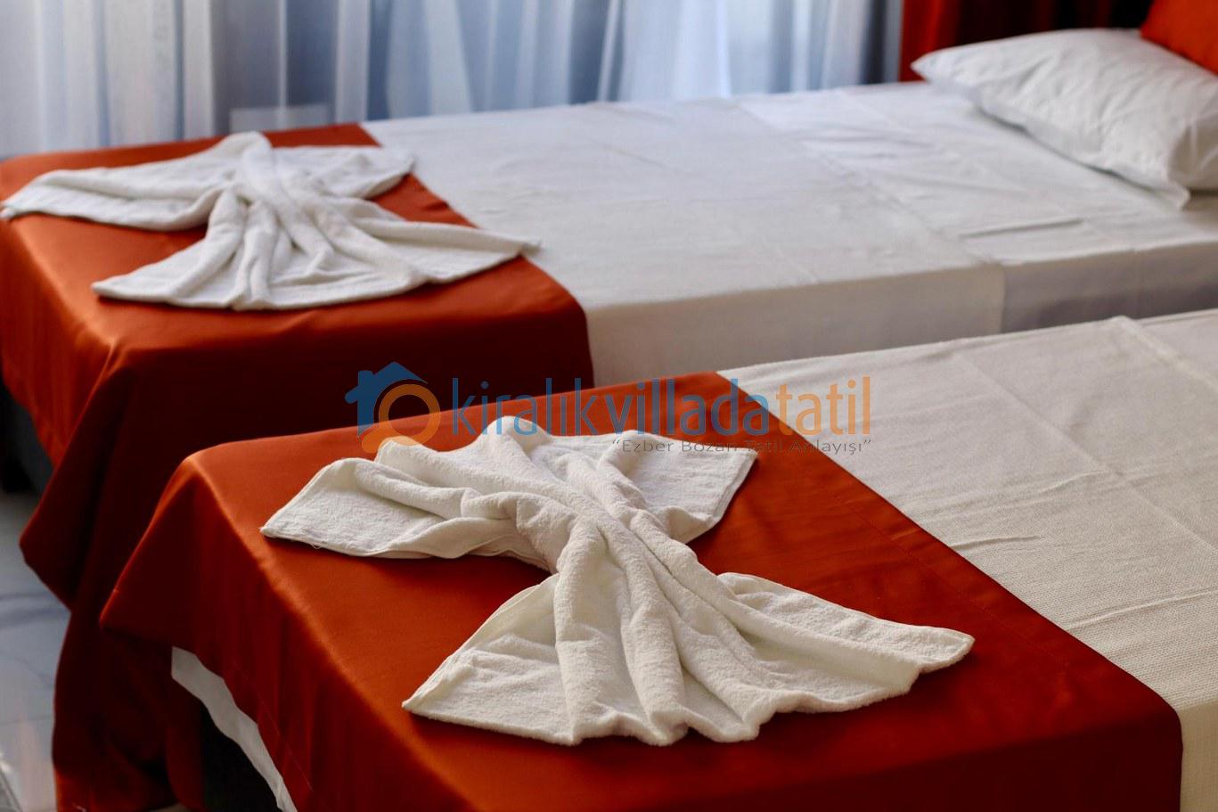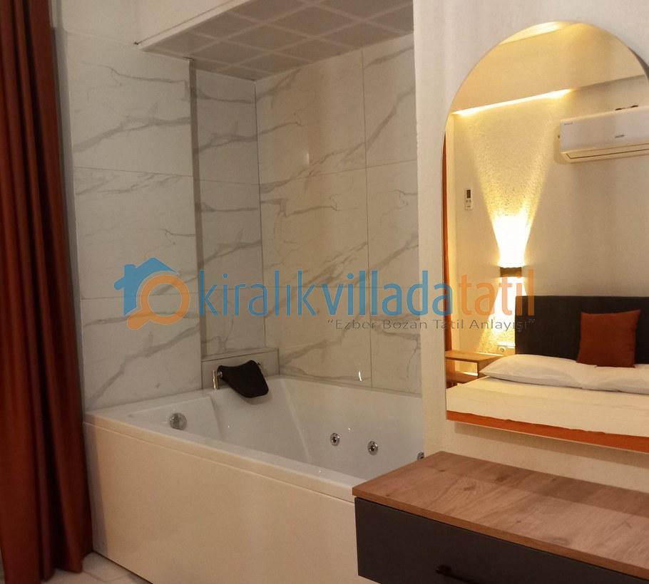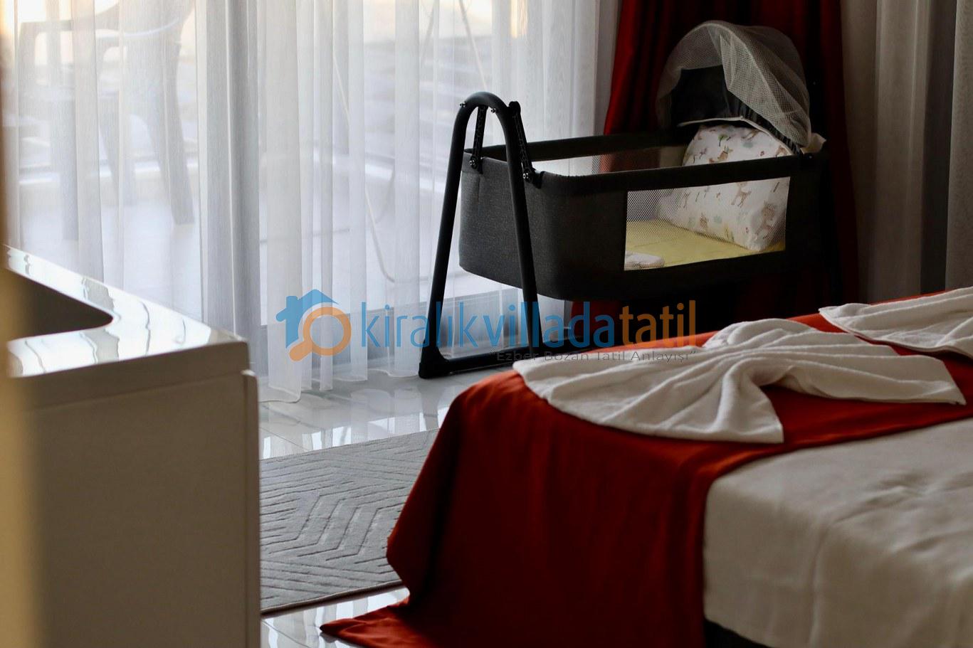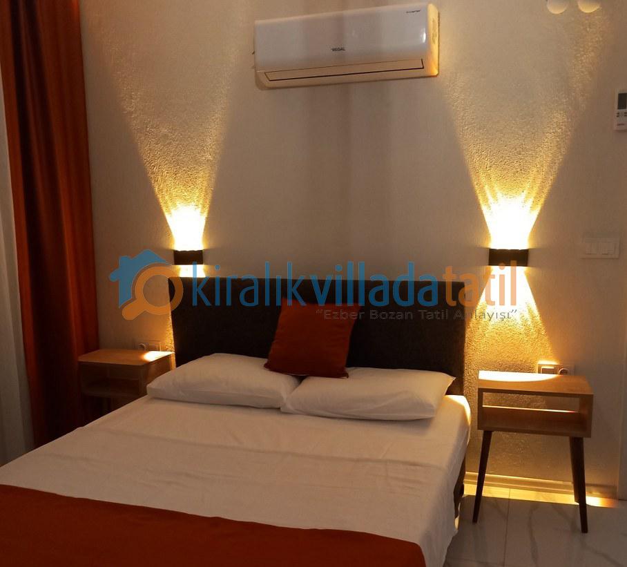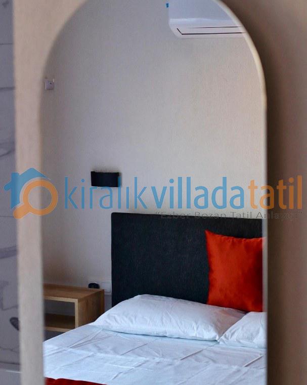 Toplam 4 yatak odası ile 8 kişilik kapasiteye sahip olan villada tüm odalar ebeveyn banyoludur. Birinci ve ikinci yatak odasında bulunan çift kişilik jakuziler, tatilinize ayrıcalıklı bir konfor katarken; diğer iki odada yer alan tek kişilik yataklar özellikle çocuklu aileler için fonksiyonel bir kullanım sunar. Tüm odalarda klima, elbise dolabı, makyaj masası ve komodin yer almaktadır.