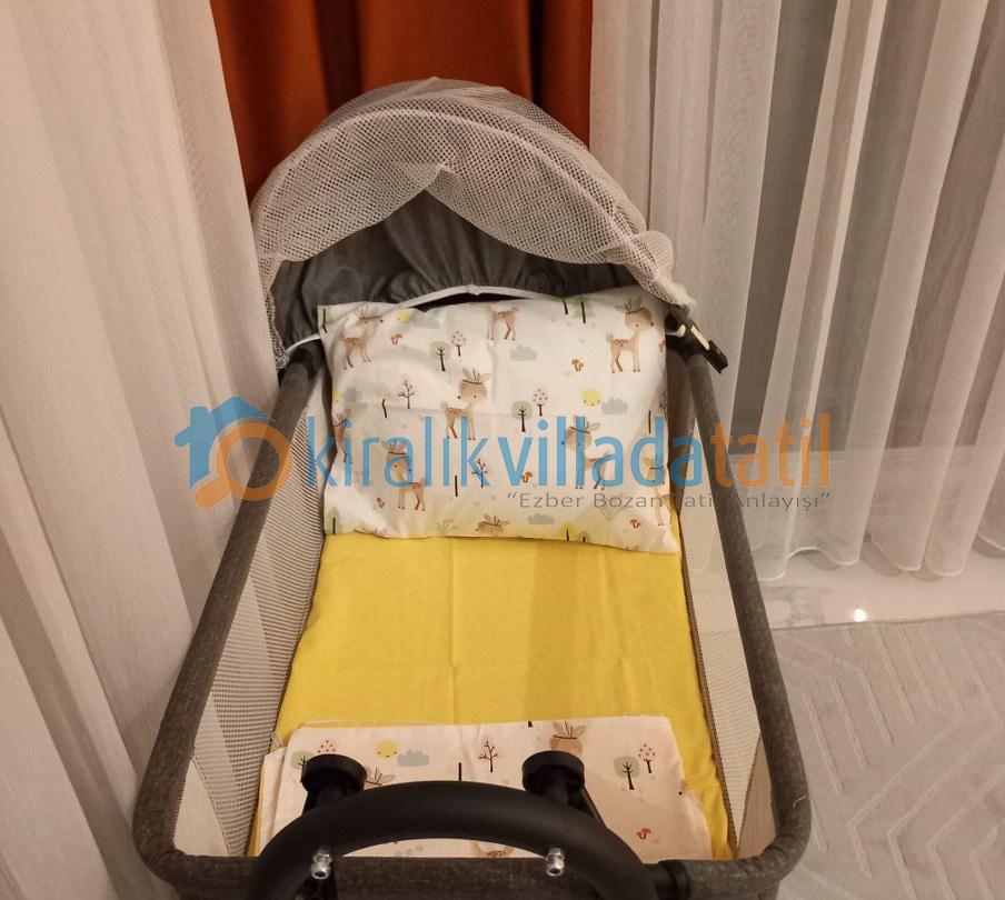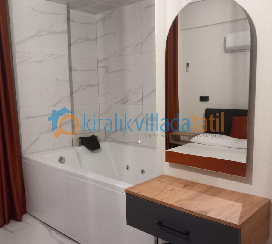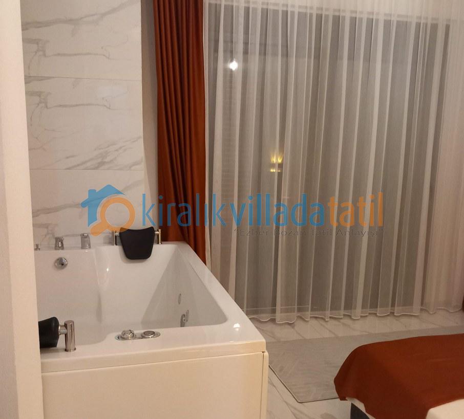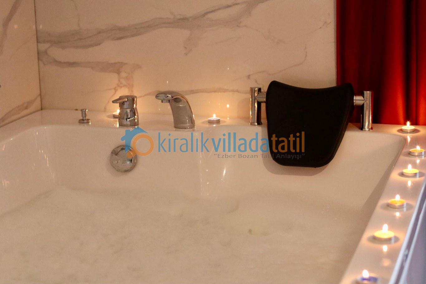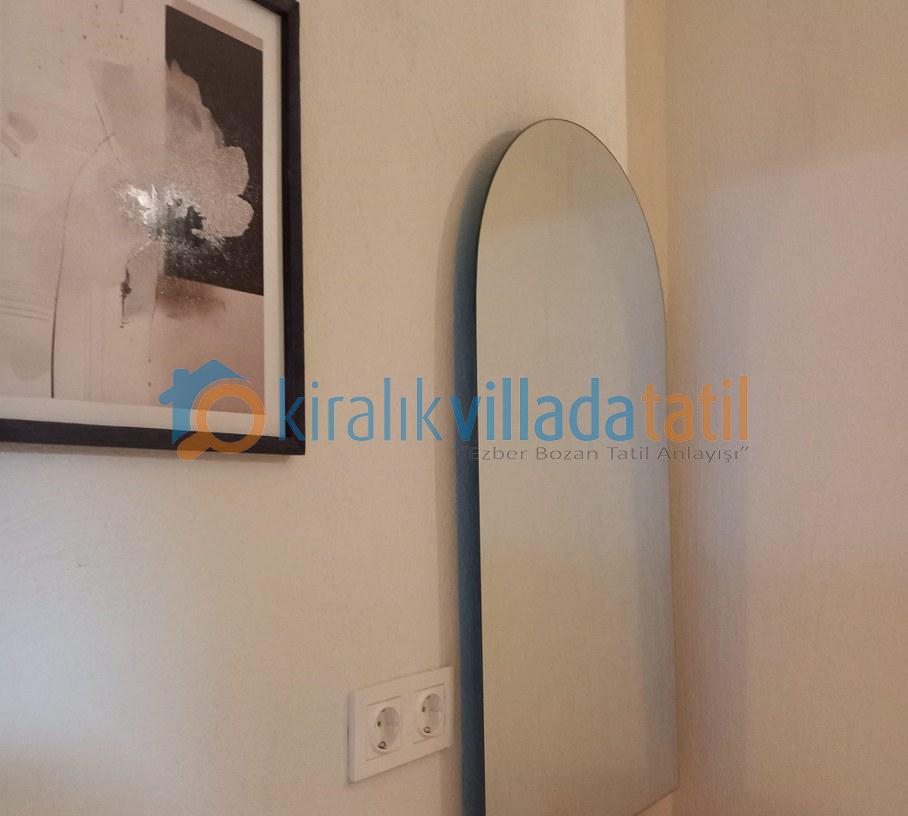 Toplam 4 yatak odası ile 8 kişilik kapasiteye sahip olan villada tüm odalar ebeveyn banyoludur. Birinci ve ikinci yatak odasında bulunan çift kişilik jakuziler, tatilinize ayrıcalıklı bir konfor katarken; diğer iki odada yer alan tek kişilik yataklar özellikle çocuklu aileler için fonksiyonel bir kullanım sunar. Tüm odalarda klima, elbise dolabı, makyaj masası ve komodin yer almaktadır.