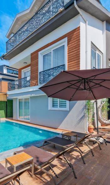 Bu ilan ait Detaylı açıklama ve bilinmesi gereken detaylarFethiye Karagedik bölgesinde yer alan bu lüks tatil villası, kalabalık aileler ve arkadaş grupları için ideal bir konaklama imkânı sunmaktadır. Doğa ile iç içe sakin bir konumda yer alan villa, özel yüzme havuzu ve geniş bahçesiyle misafirlerine konforlu, huzurlu ve keyifli bir tatil ortamı sağlamaktadır. Havuz ve bahçe alanı dışarıdan görünmeyecek şekilde planlanmıştır; bu sayede misafirlerin mahremiyeti ön planda tutulmaktadır.