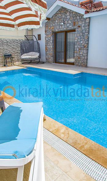 Taş ve ahşap yapıdan oluşmakta olan villamızın içerisi ultra lüks hazırlanmış olup villamız 2 oda 1 açık plan mutfak şeklinde dizayn edilmiştir. Villamızın kendine ait 40m² özel havuzu bulunmaktadır. Havuzun derinliği 1.40cm-150cm aralığında eğimlidir. Havuzumuzun etrafı branda sistemiyle kapalı olup ailenizle rahatlıkla havuz keyfi yapmanızı sağlar.