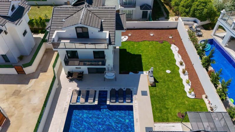 Geniş ve ferah yaşam alanına sahip olan villanın salonundan direkt olarak özel yüzme havuzunun bulunduğu bahçeye geçiş sağlanır gün boyu güneş alan havuz terası dinlenmek ve keyifli vakit geçirmek için ideal bir ortam oluşturur bahçe içerisinde yer alan barbekü alanı ise akşam saatlerinde sevdiklerinizle birlikte keyifli yemekler hazırlayabileceğiniz özel bir alan sunar