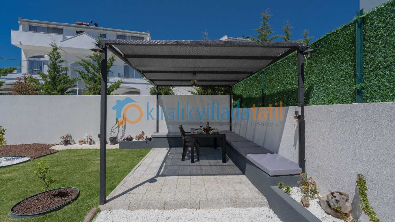 Geniş ve ferah yaşam alanına sahip olan villanın salonundan direkt olarak özel yüzme havuzunun bulunduğu bahçeye geçiş sağlanır gün boyu güneş alan havuz terası dinlenmek ve keyifli vakit geçirmek için ideal bir ortam oluşturur bahçe içerisinde yer alan barbekü alanı ise akşam saatlerinde sevdiklerinizle birlikte keyifli yemekler hazırlayabileceğiniz özel bir alan sunar
