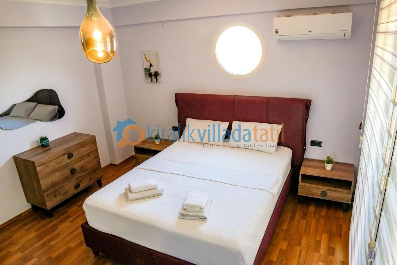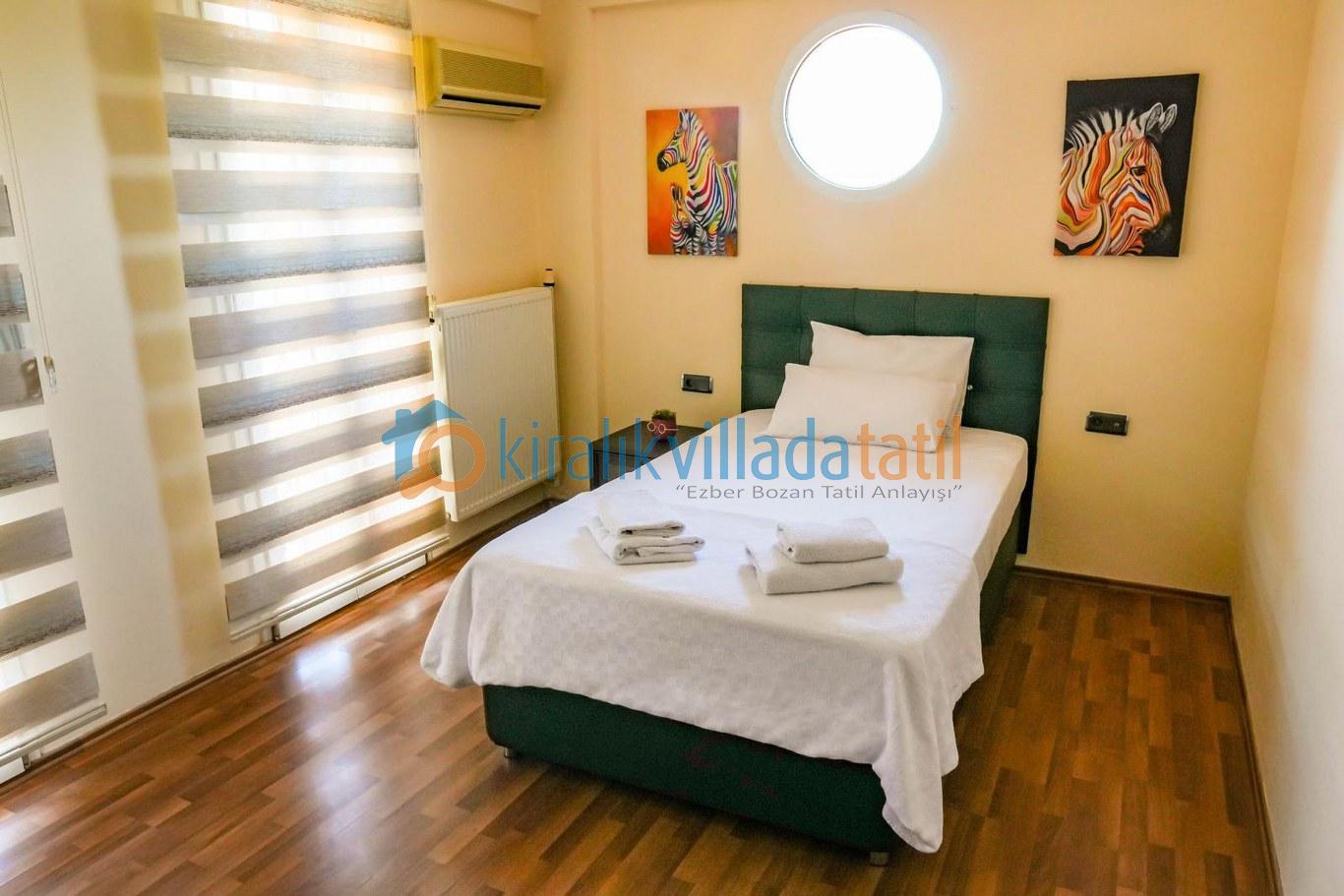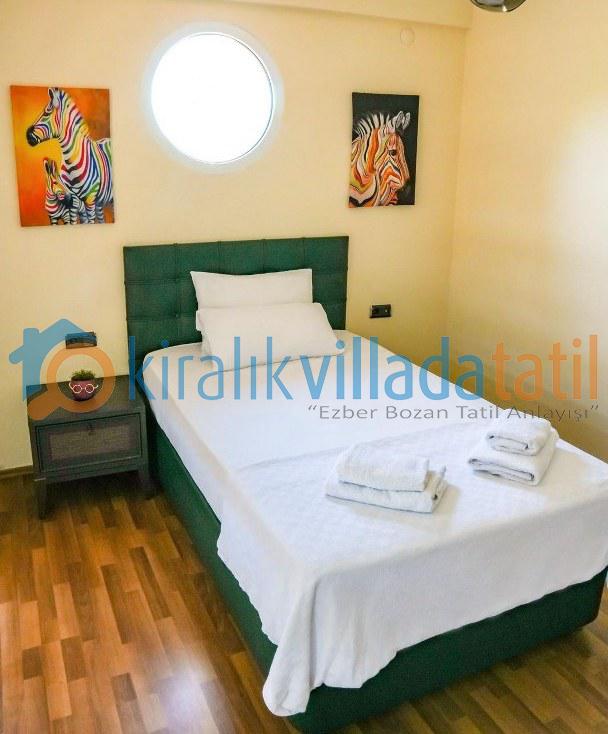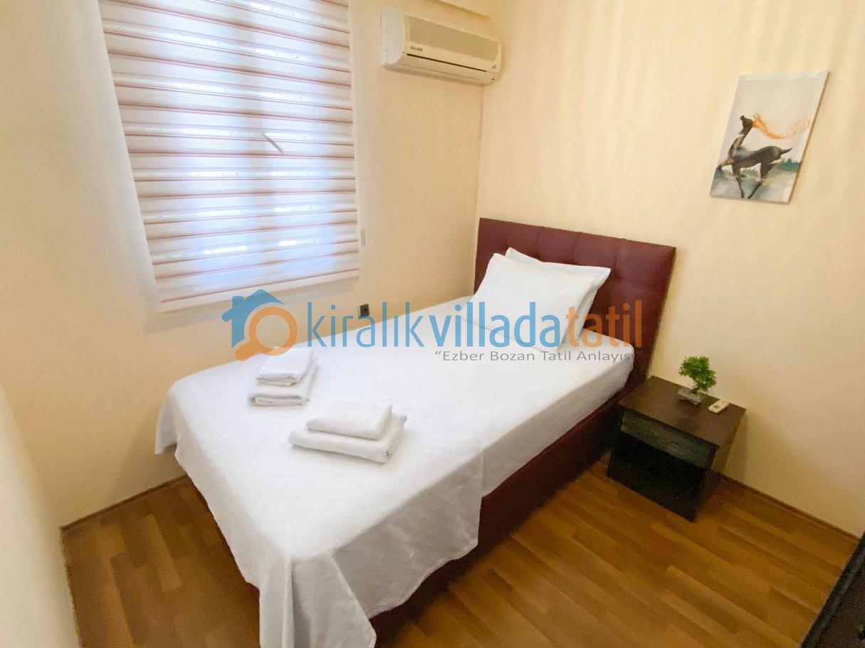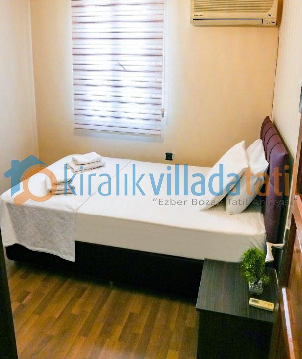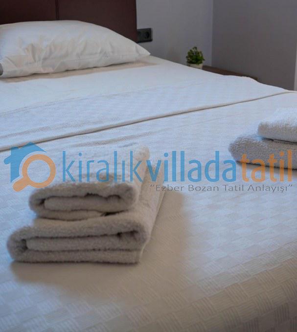 Üç yatak odası ve üç banyosu bulunan villa, altı kişiye kadar konaklama imkânı sağlayarak geniş aileler ve arkadaş grupları için konforlu bir alan oluşturuyor. Ferah iç mekân düzeni, her misafirin kendine ait alan bulabilmesine olanak tanırken, ebeveyn banyolu odalar sayesinde mahremiyet ön planda tutuluyor.