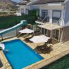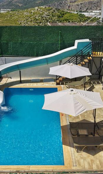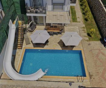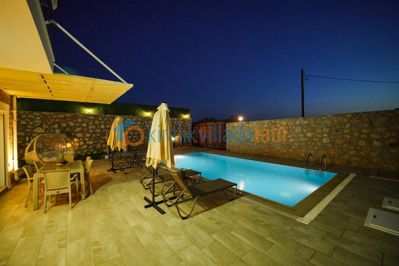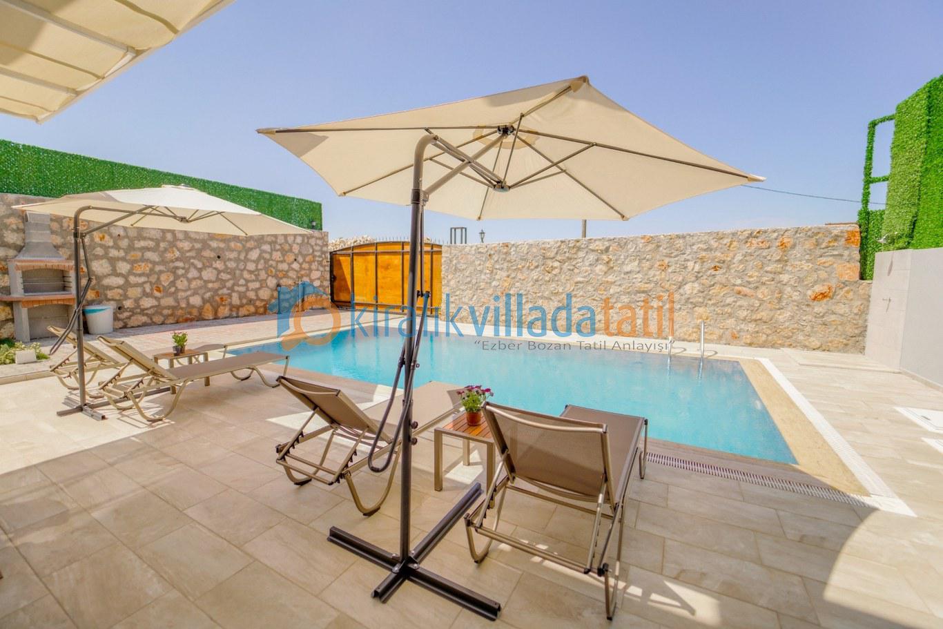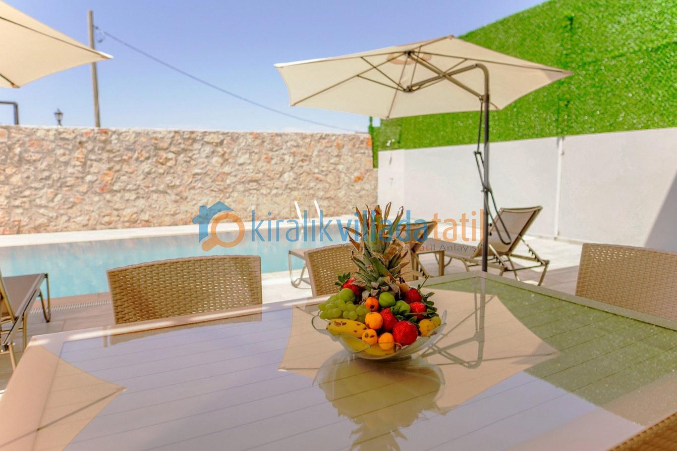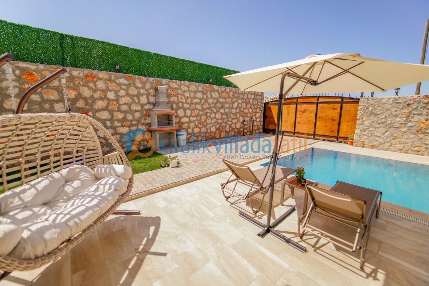 Villamız, tamamen korunaklı havuz alanı ile dışarıdan görünmeden rahatça vakit geçirme imkânı sunar. Bu özelliğiyle, mahremiyete önem veren muhafazakâr aileler için de son derece uygundur. Geniş havuz terasında, kapasiteye uygun şezlong takımı, konforlu oturma grubu, salıncak ve barbekü alanı yer almaktadır. Gün boyu güneşin tadını çıkarabilir, akşamları sevdiklerinizle havuz kenarında keyifli barbekü partileri düzenleyebilirsiniz.