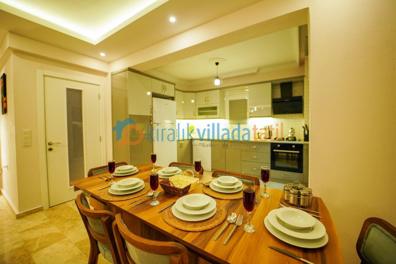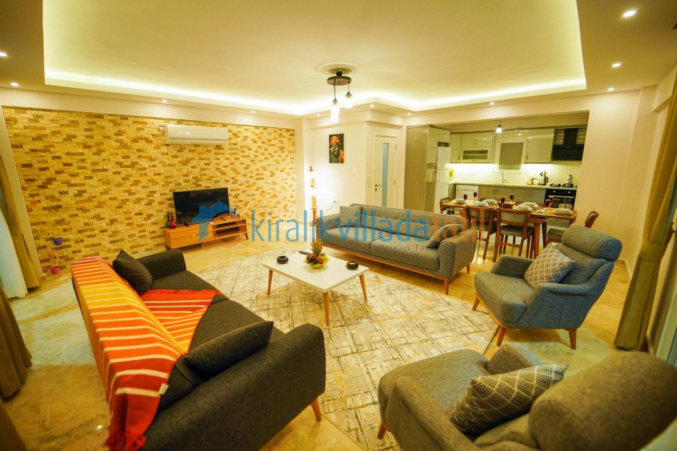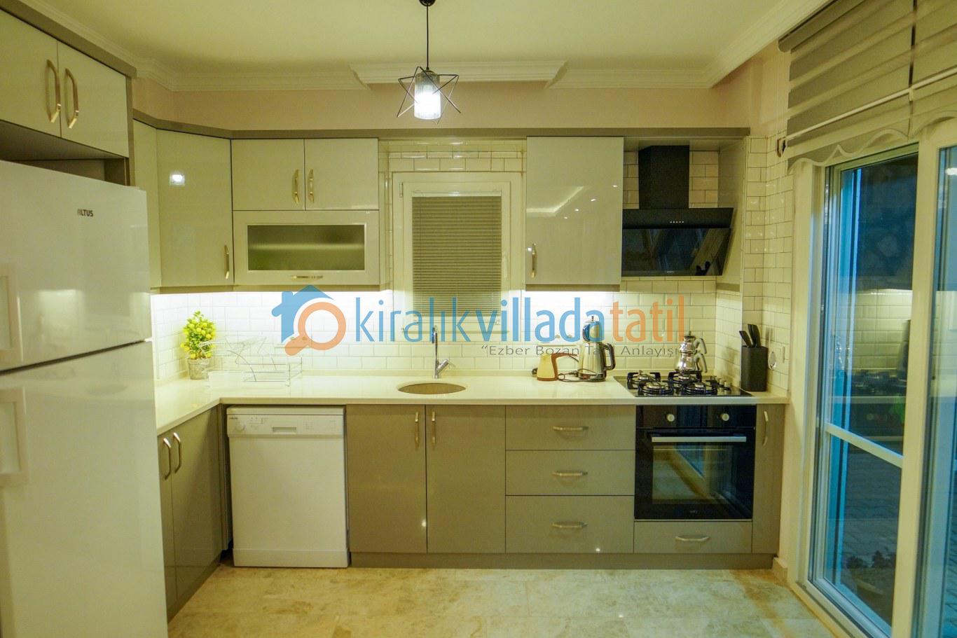 Villanın iç kısmında, ferah ve modern bir oturma odası ile tam donanımlı Amerikan mutfak bulunur. Tatiliniz süresince ihtiyaç duyabileceğiniz tüm mutfak ekipmanları (fırın, bulaşık makinesi, mikrodalga, su ısıtıcı vb.) eksiksiz olarak yer almaktadır.