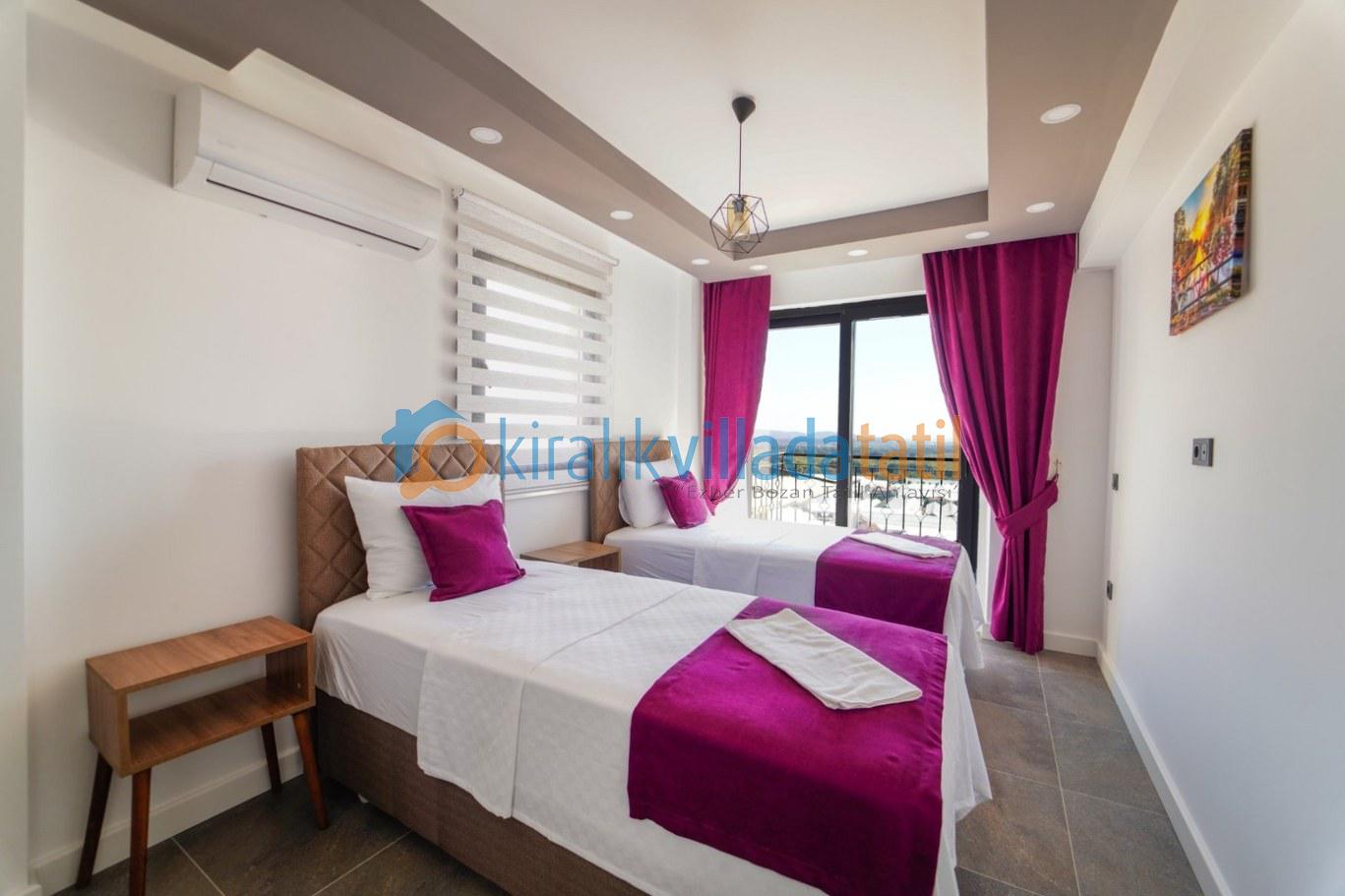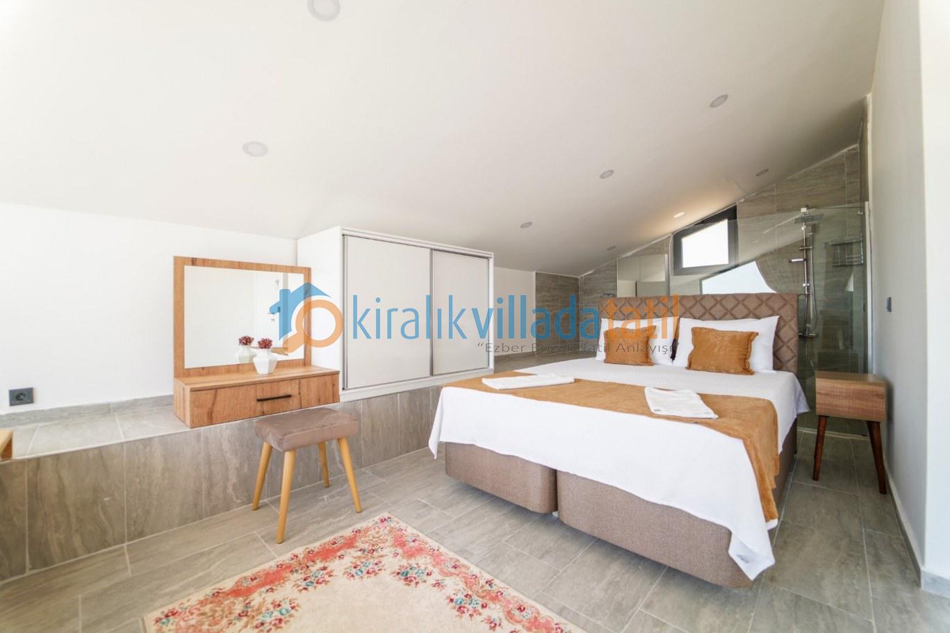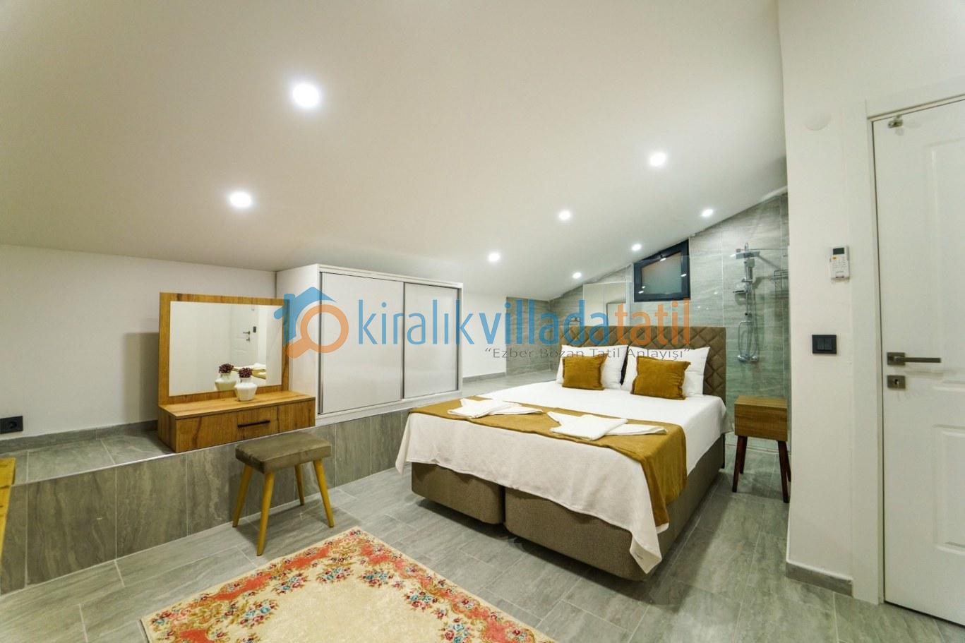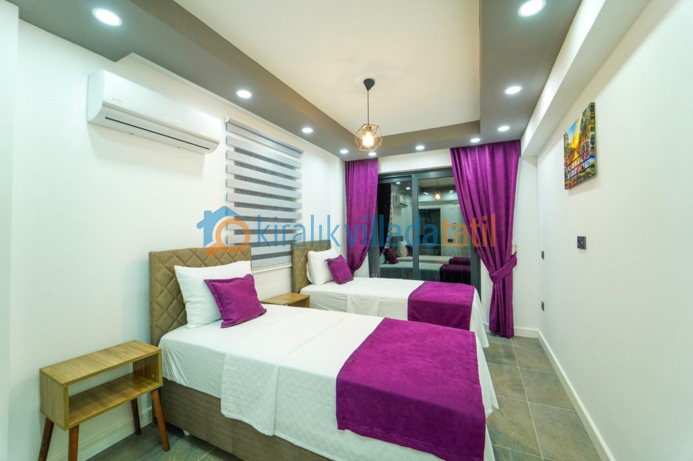 Dört yatak odasına sahip olan villanın, üç yatak odasında çift kişilik yataklar, diğer yatak odasında ise, iki adet tek kişilik yataklar bulunmaktadır. Odaların, kendilerine ait, klima, gardrop, banyo-wc gibi olanakları da mevcuttur.