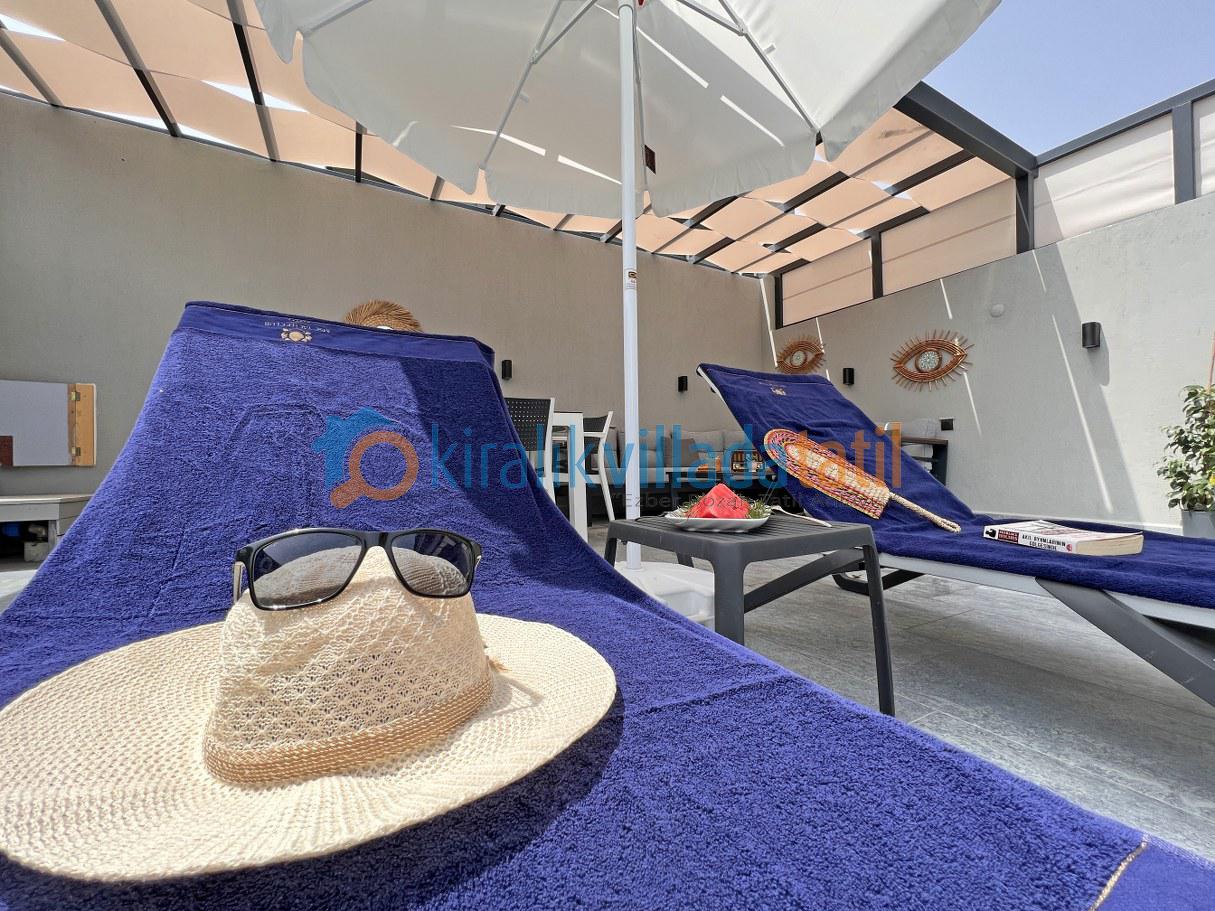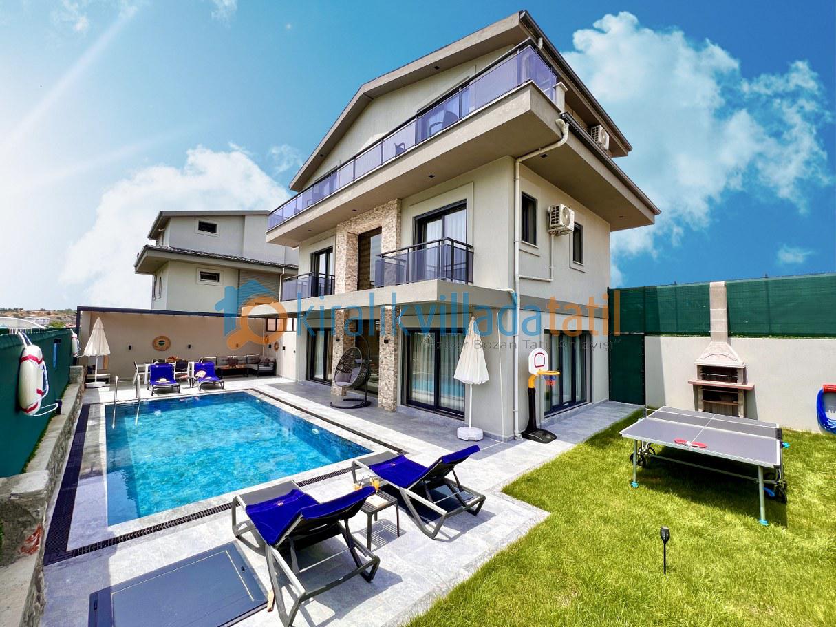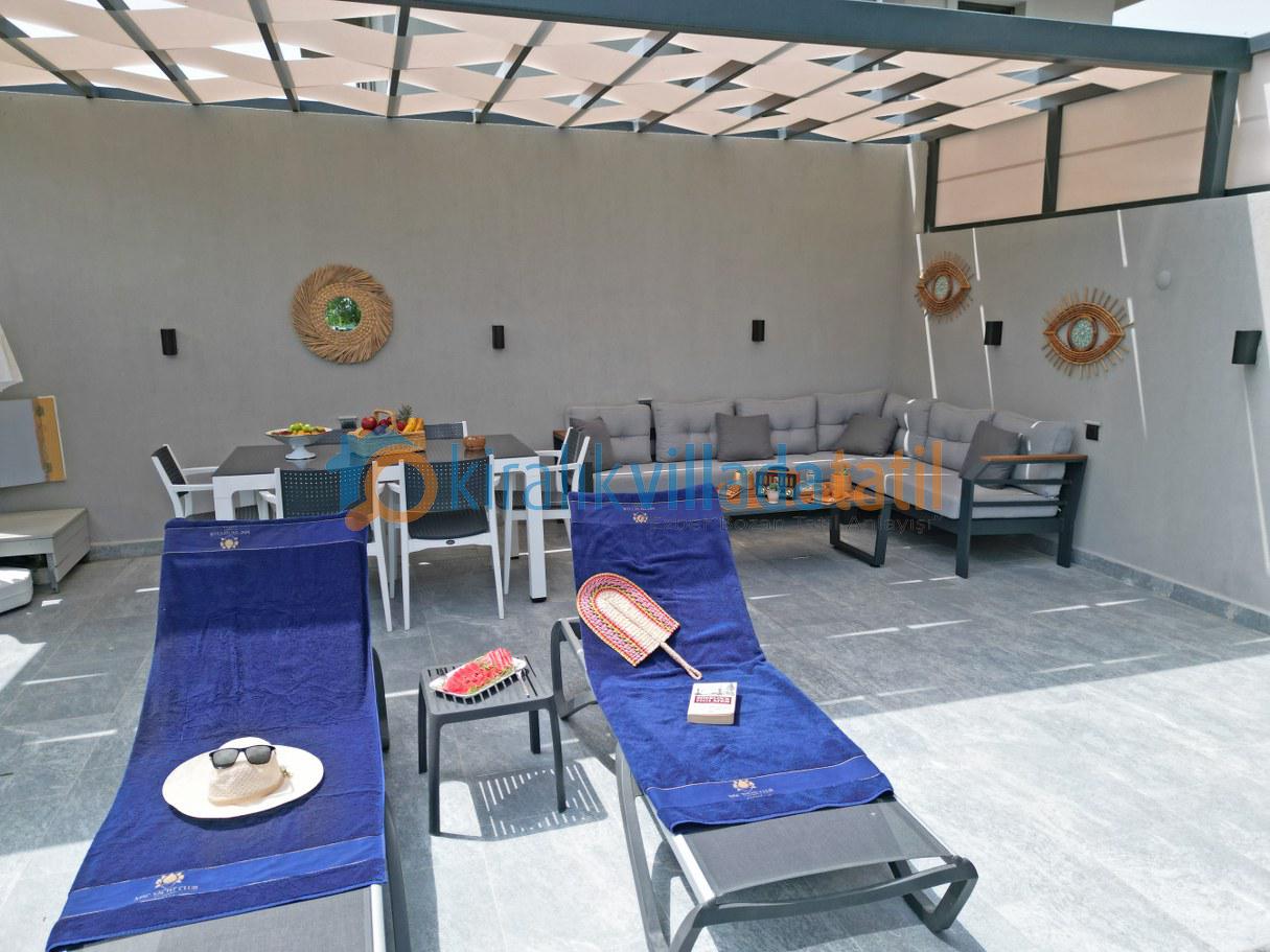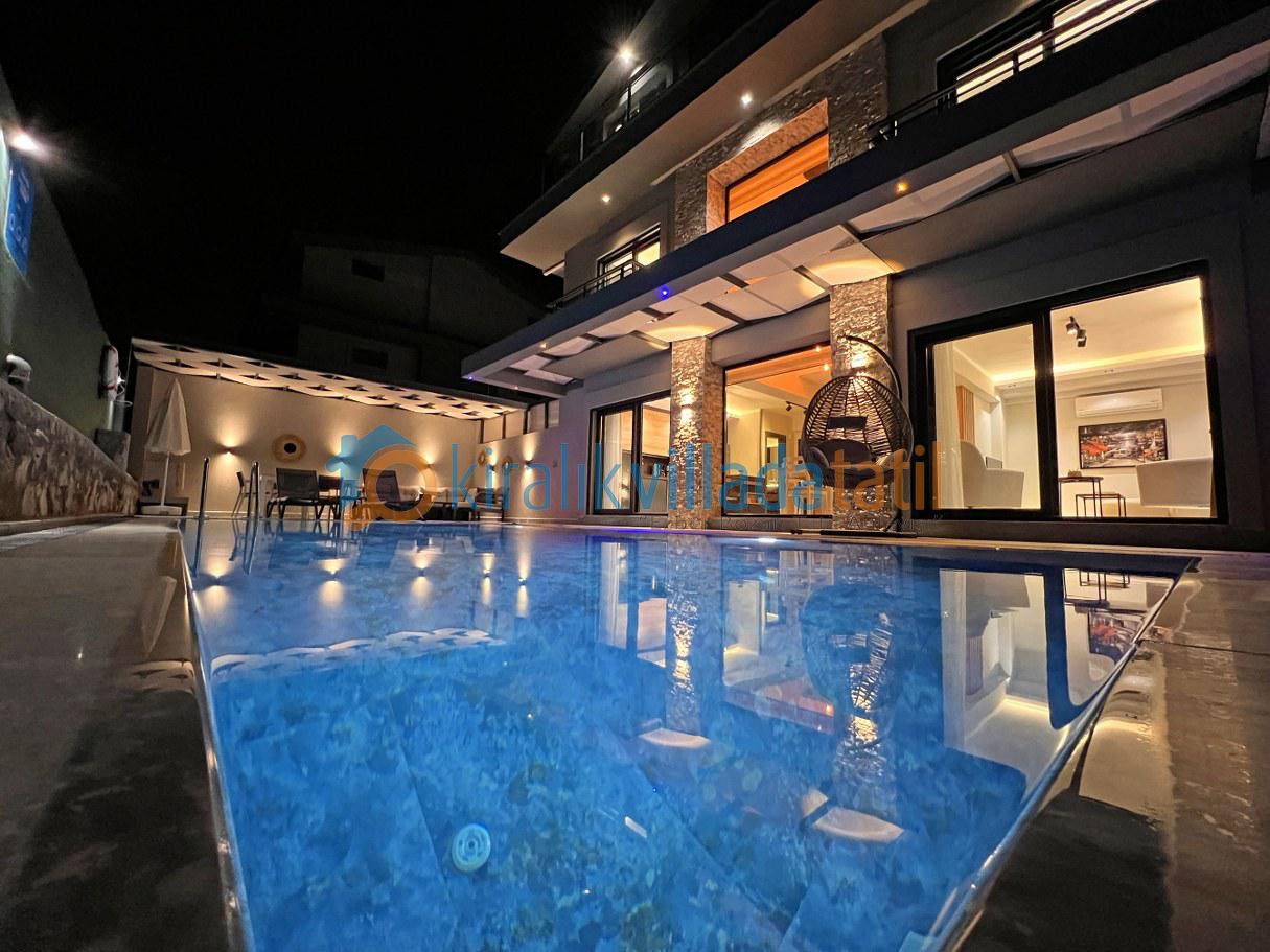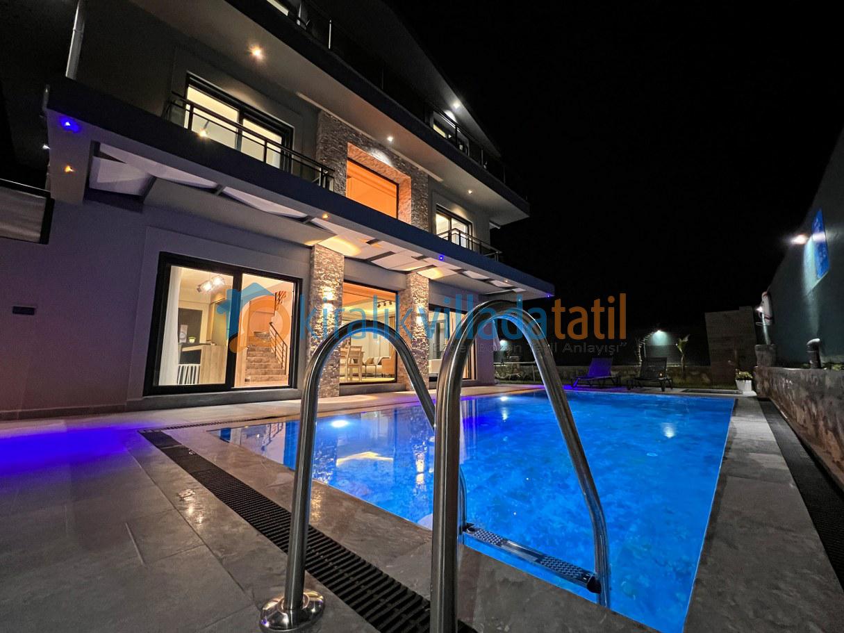 Bu ilan ait Detaylı açıklama ve bilinmesi gereken detaylarDoğanın huzurunu modern yaşam konforuyla birleştiren bu özel villa, Fethiye’nin yemyeşil atmosferiyle öne çıkan Esenköy mevkiinde yer almaktadır. Şehrin gürültüsünden uzak, tamamen doğayla iç içe bir ortamda konumlanan villamız; geniş kapasitesi, modern tasarımı ve sunduğu imkanlarla kalabalık aileler ve arkadaş grupları için mükemmel bir tatil seçeneğidir. Toplamda 4 yatak odası ve 8 kişilik konaklama kapasitesi bulunan villamız, ferah iç mekanları ve geniş bahçe alanıyla misafirlerine rahat bir tatil alanı sunar. Esenköy’ün doğayla bütünleşen sakin atmosferi, villaya ayrı bir huzur katar. Ayrıca merkeze ve çevredeki popüler turistik noktalara kısa sürede ulaşabilme avantajı, tatil boyunca konforlu bir deneyim sağlar. Villanın dış alanı, günün her saatinde keyifle vakit geçirilebilecek şekilde tasarlanmıştır. 7.5 x 3.5 metre ölçülerinde ve 1.50 metre derinliğinde özel yüzme havuzu tamamen korunaklı olup, dışarıdan görünmeyecek biçimde planlanmıştır.