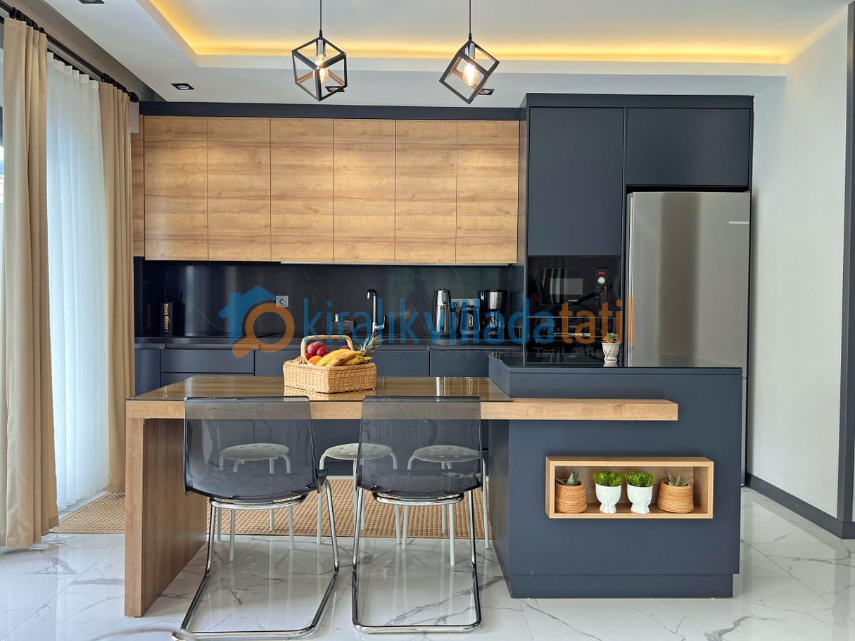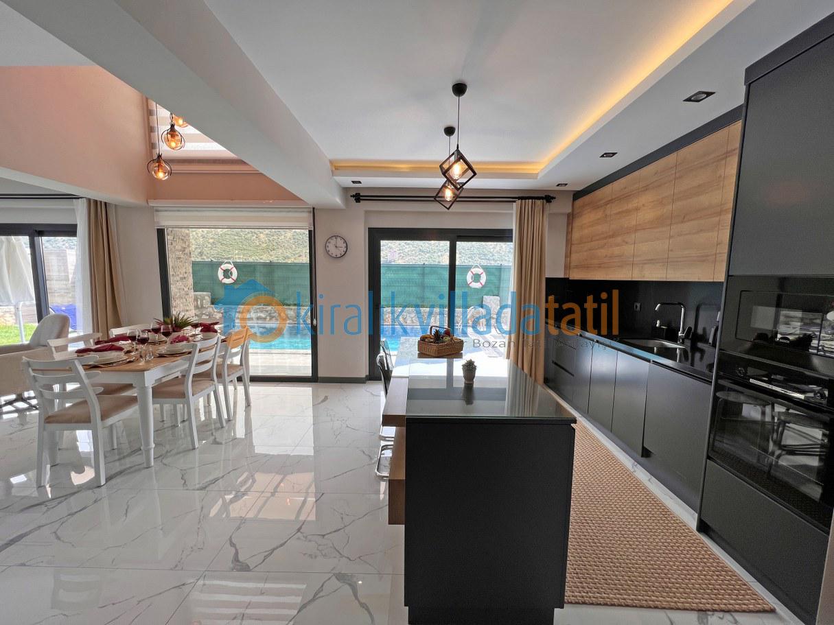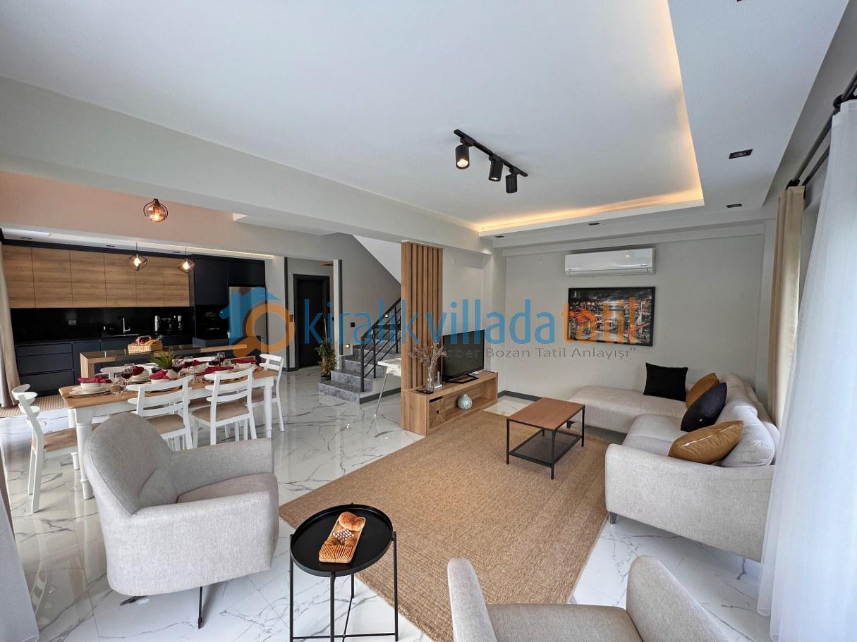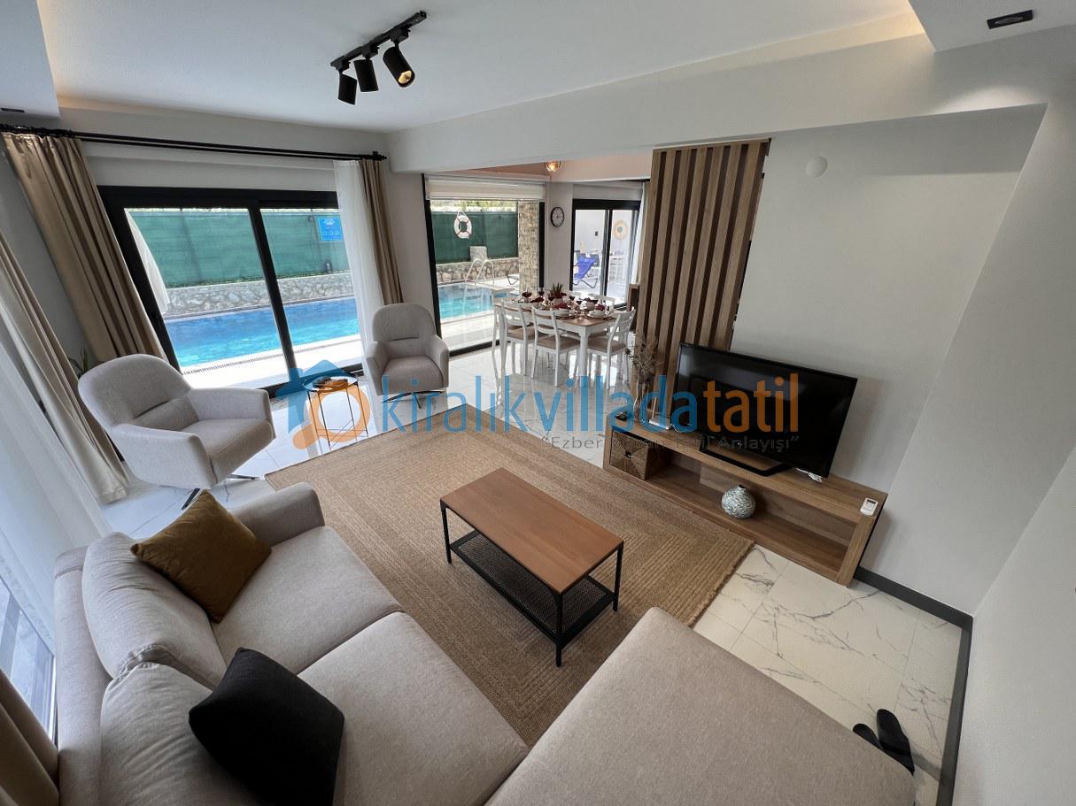 Bu özelliğiyle, mahremiyetine önem veren muhafazakâr aileler için ideal bir konaklama ortamı sunar. Geniş havuz terasında şezlonglar, oturma alanı ve barbekü köşesi bulunur; böylece hem güneşlenmek hem de akşam saatlerinde sevdiklerinizle keyifli yemekler hazırlamak mümkündür. Villanın iç kısmı, sade ama şık bir tasarım anlayışıyla döşenmiştir. Geniş oturma odası, konforlu koltuk takımı ve doğa manzarasına bakan büyük pencereleriyle ferah bir yaşam alanı sunar. Açık mutfak konseptiyle birleşen bu alan, tatilde de ev rahatlığını arayan misafirler için son derece kullanışlıdır. Modern mutfak ekipmanları (fırın, buzdolabı, ocak, yemek takımı ve mutfak gereçleri) eksiksiz şekilde yer almaktadır.