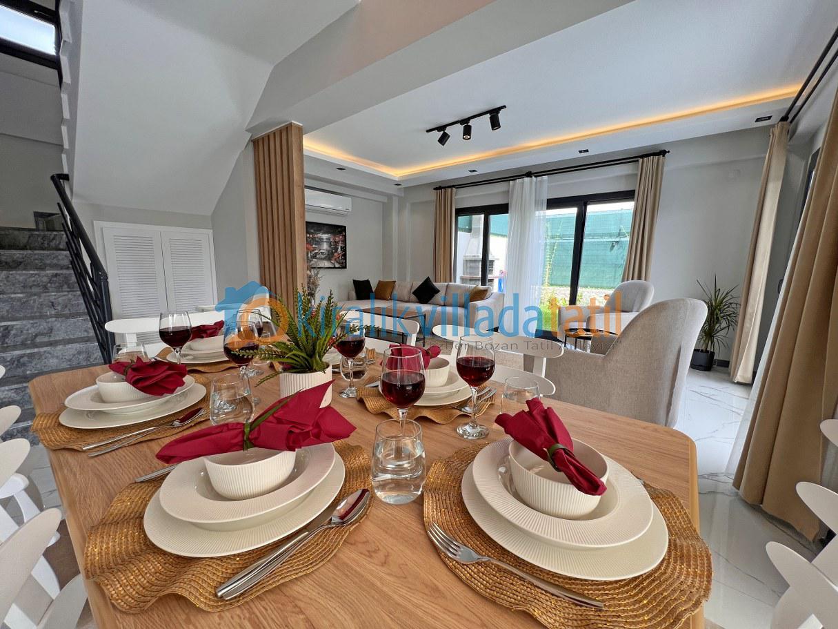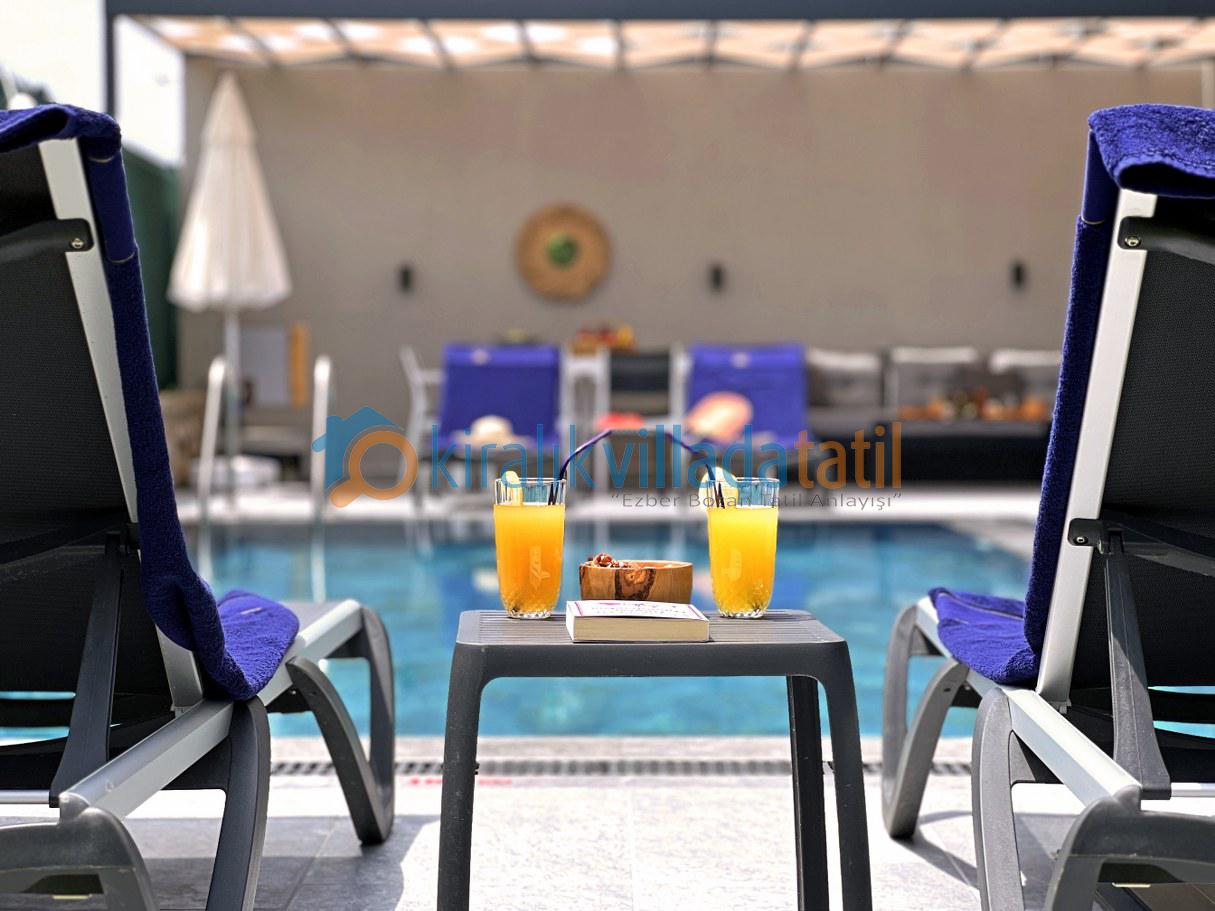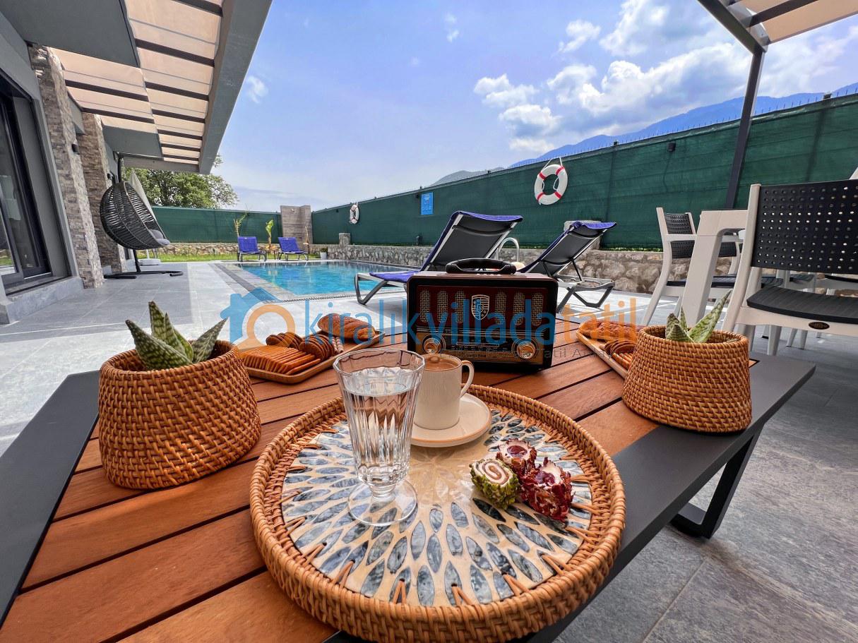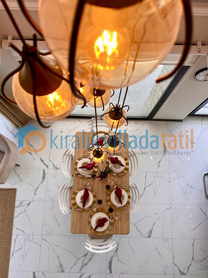 Bu özelliğiyle, mahremiyetine önem veren muhafazakâr aileler için ideal bir konaklama ortamı sunar. Geniş havuz terasında şezlonglar, oturma alanı ve barbekü köşesi bulunur; böylece hem güneşlenmek hem de akşam saatlerinde sevdiklerinizle keyifli yemekler hazırlamak mümkündür. Villanın iç kısmı, sade ama şık bir tasarım anlayışıyla döşenmiştir. Geniş oturma odası, konforlu koltuk takımı ve doğa manzarasına bakan büyük pencereleriyle ferah bir yaşam alanı sunar. Açık mutfak konseptiyle birleşen bu alan, tatilde de ev rahatlığını arayan misafirler için son derece kullanışlıdır. Modern mutfak ekipmanları (fırın, buzdolabı, ocak, yemek takımı ve mutfak gereçleri) eksiksiz şekilde yer almaktadır.