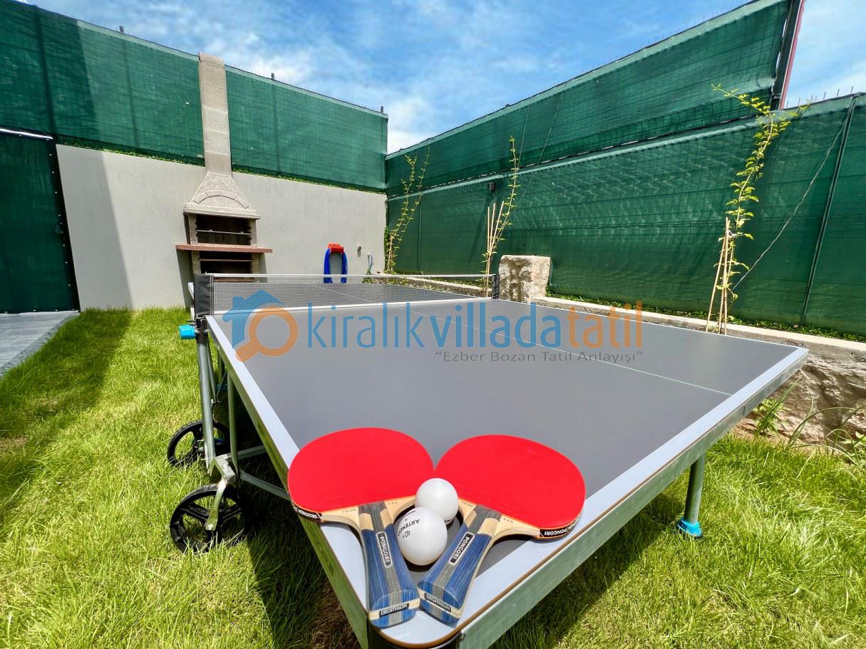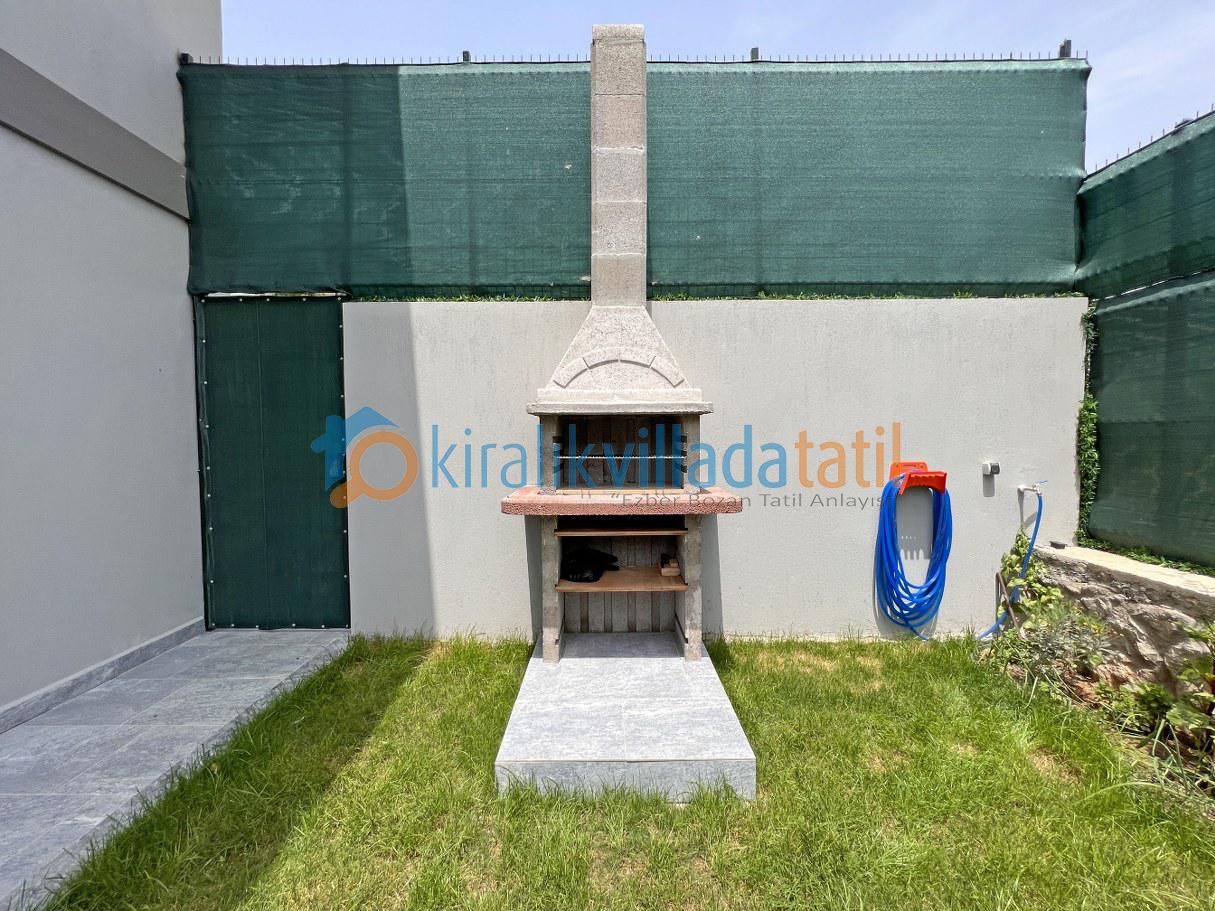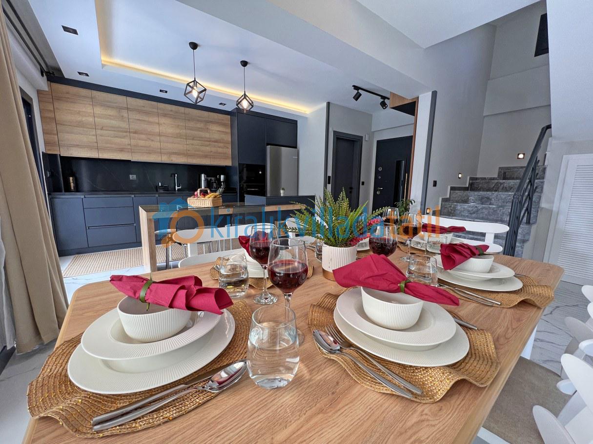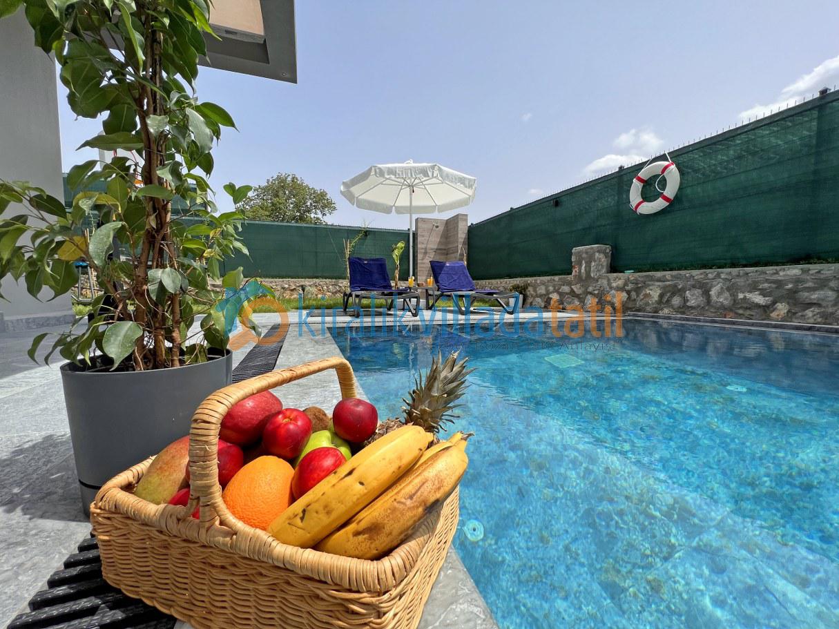 Bu özelliğiyle, mahremiyetine önem veren muhafazakâr aileler için ideal bir konaklama ortamı sunar. Geniş havuz terasında şezlonglar, oturma alanı ve barbekü köşesi bulunur; böylece hem güneşlenmek hem de akşam saatlerinde sevdiklerinizle keyifli yemekler hazırlamak mümkündür. Villanın iç kısmı, sade ama şık bir tasarım anlayışıyla döşenmiştir. Geniş oturma odası, konforlu koltuk takımı ve doğa manzarasına bakan büyük pencereleriyle ferah bir yaşam alanı sunar. Açık mutfak konseptiyle birleşen bu alan, tatilde de ev rahatlığını arayan misafirler için son derece kullanışlıdır. Modern mutfak ekipmanları (fırın, buzdolabı, ocak, yemek takımı ve mutfak gereçleri) eksiksiz şekilde yer almaktadır.
