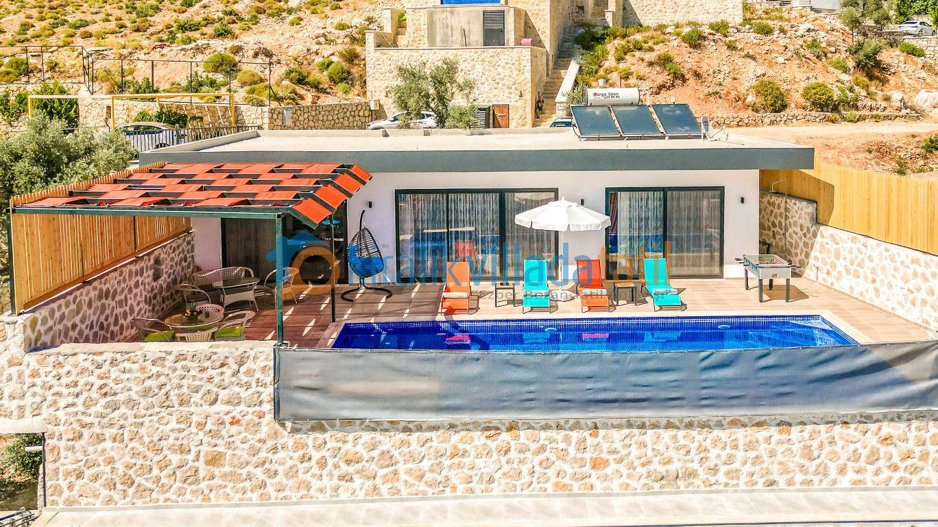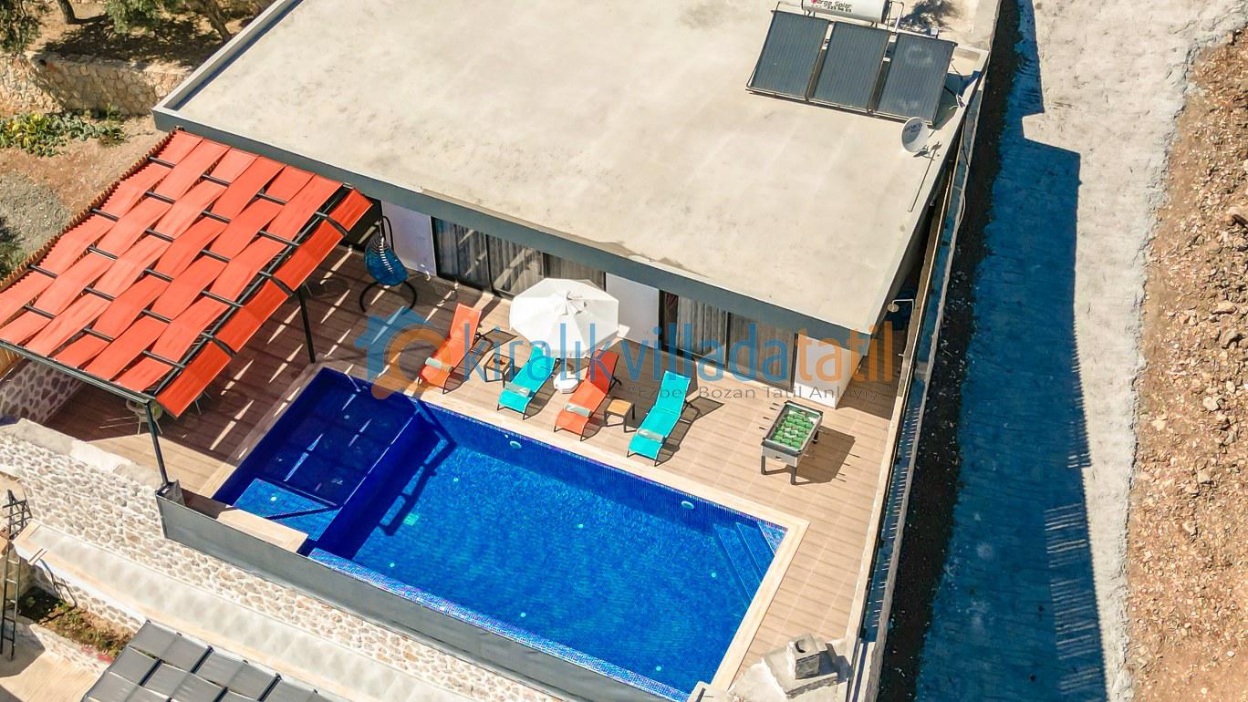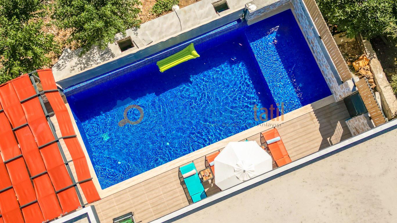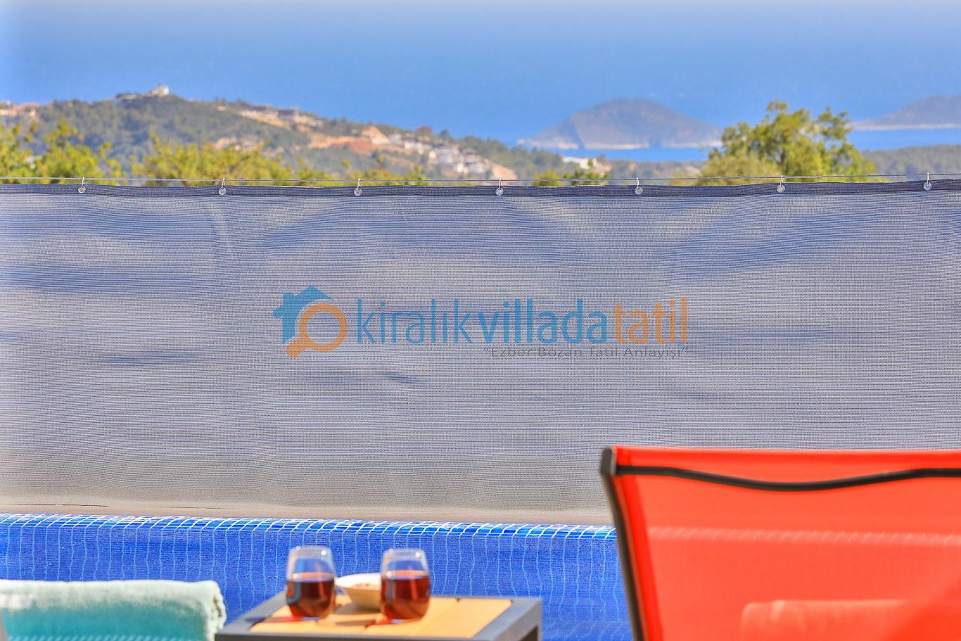 Sessiz ve huzurlu konumda yer alan villanın havuz ve havuz terası alanı perde ve çit sistemi ile çevrilerek tamamen korunaklı hale getirilmiştir. Bu sayede gözlerden uzak tatil yapmak isteyen muhafazakâr aileler ve balayı çiftleri için rahat bir kullanım sunar. Doğa manzarası eşliğinde özel havuz keyfi yaşayabileceğiniz güvenli bir ortam oluşturulmuştur.