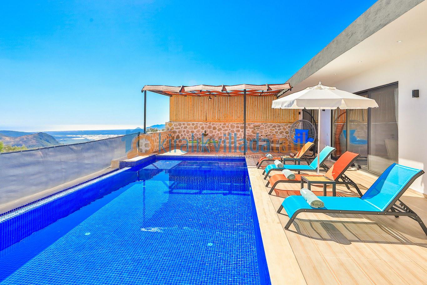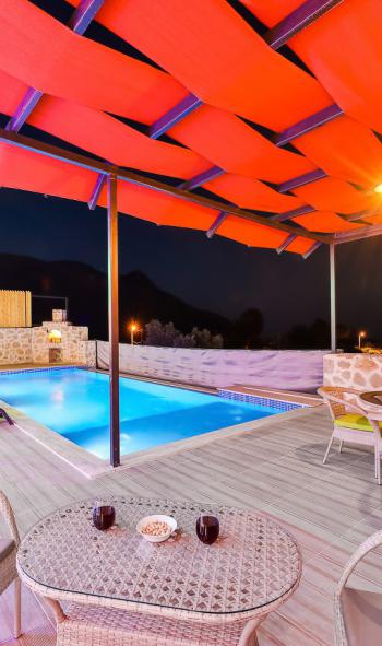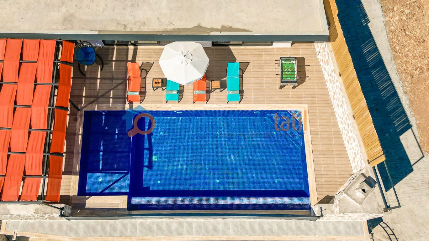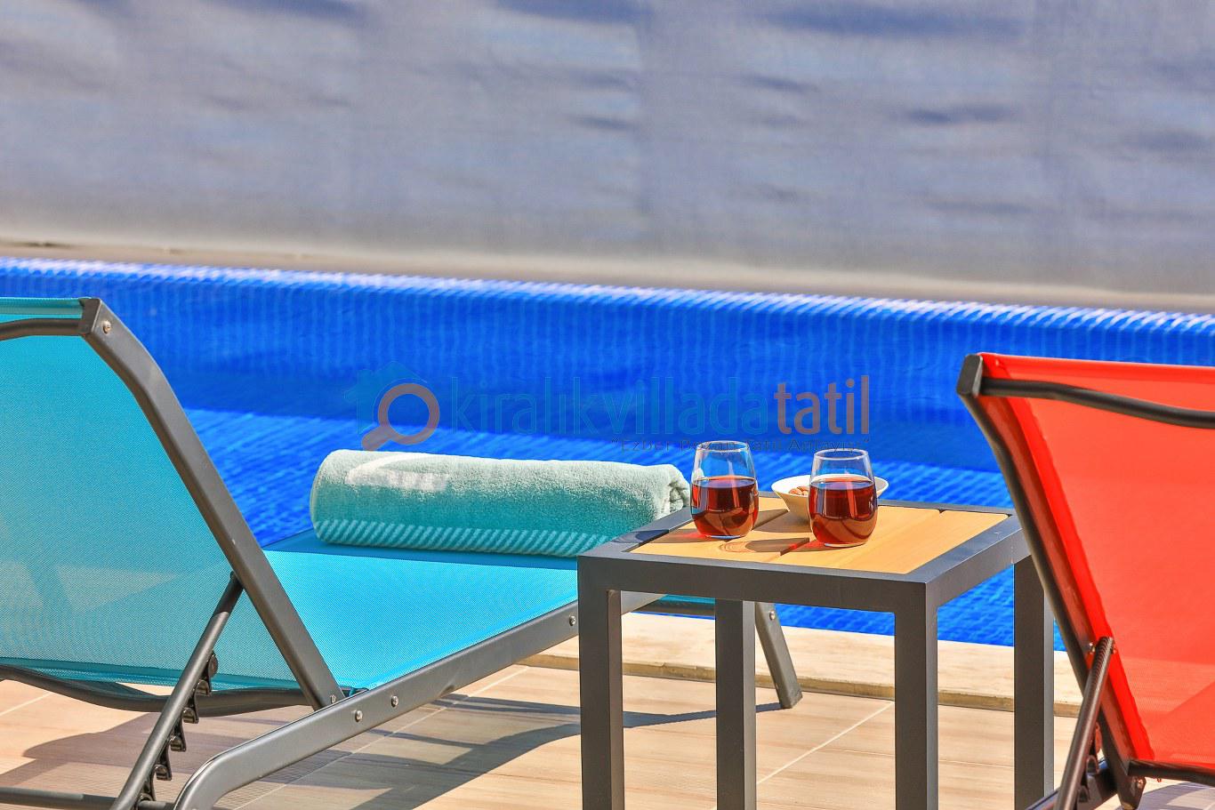 Sessiz ve huzurlu konumda yer alan villanın havuz ve havuz terası alanı perde ve çit sistemi ile çevrilerek tamamen korunaklı hale getirilmiştir. Bu sayede gözlerden uzak tatil yapmak isteyen muhafazakâr aileler ve balayı çiftleri için rahat bir kullanım sunar. Doğa manzarası eşliğinde özel havuz keyfi yaşayabileceğiniz güvenli bir ortam oluşturulmuştur.
