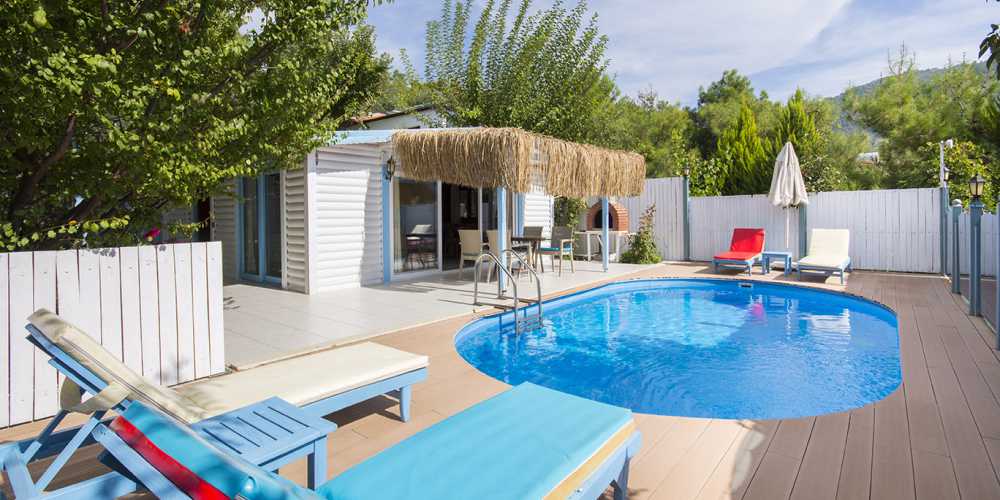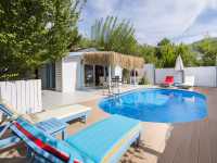 Geniş havuz terası gün boyu açık havada vakit geçirmek isteyenler için ferah bir alan sunar. doğa ile içiçe yapısı sayesinde sakin ve dingin bir tatil ortamı sağlayan villa yılın temposundan uzaklaşıp huzurlu bir konaklama arayan misafirler için uygun bir seçenektir.