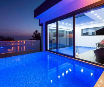Modern yapısı ve iç dizaynı ile sizlere konforlu bir tatil imkanı sunan villamızın geniş yatak odasında doğa ve deniz manzarasına karşı kapalı ve ısıtmalı havuzumuz, çift kişilik yatak, geniş ekran tv ve sauna, banyo mevcuttur.Villamız içinde ihtiyacınız tüm mobilya mutfak araç gereçleri ütü saç kurutma makinesine kadar mevcuttur.