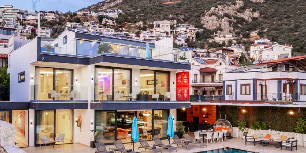 Manzarası çatı katı cam kaplı havuzu ısıtmalı dış havuzu geniş terası eğlence alanları ve merkeze yakın konumuyla bu villa deniz manzaralı villa mlüks villa ve villa kiralama arayışında olan misafirler için kalkan akbel bölgesinde öne çıkan yüksek standartlı bir tatil seçeneğidir.