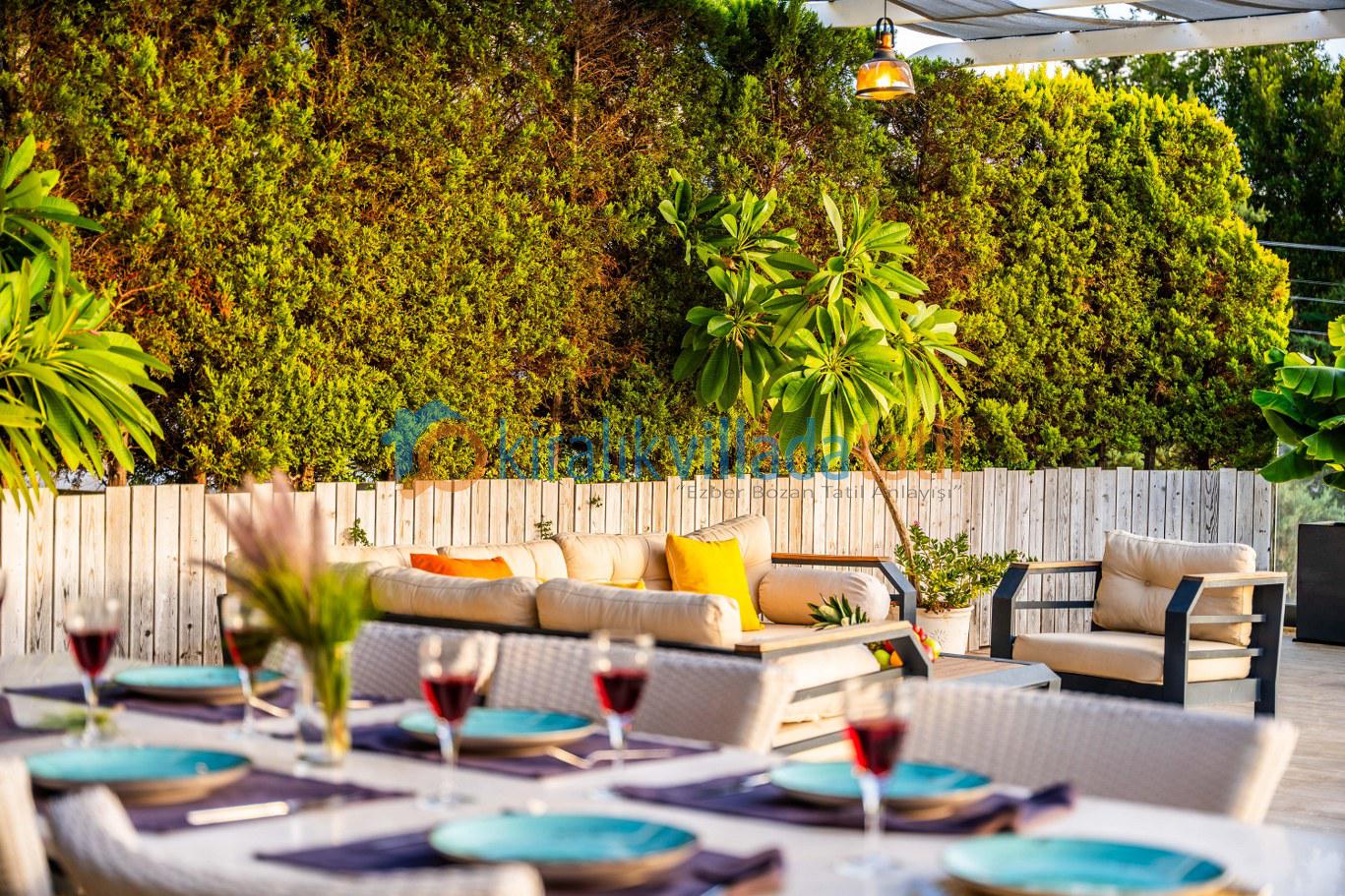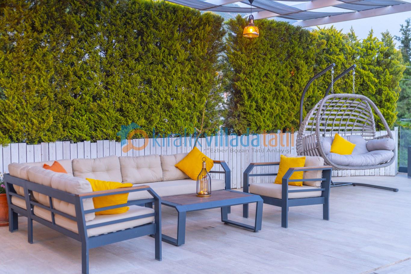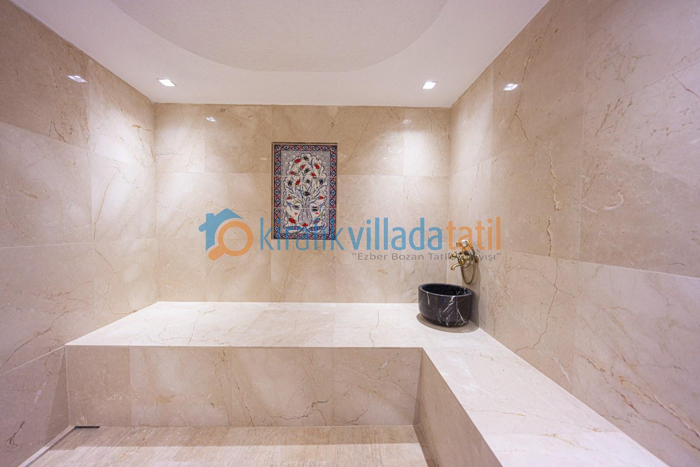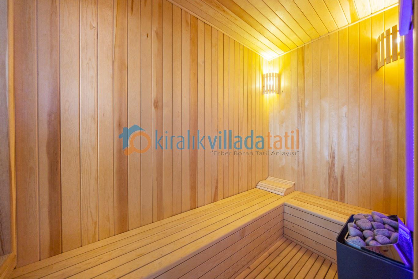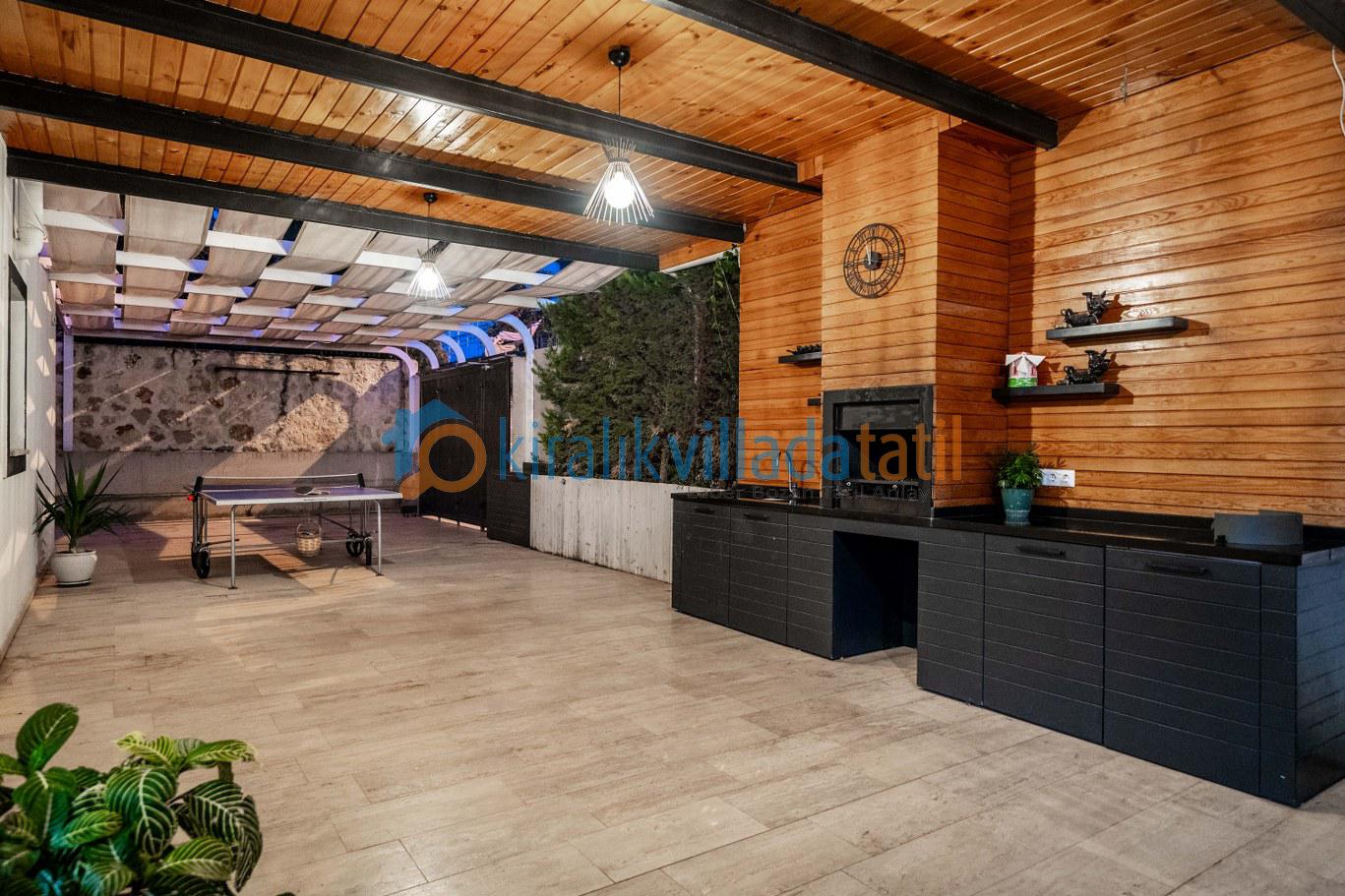 Yaklaşık 300 m² büyüklüğündeki geniş havuz terası, deniz manzarası eşliğinde keyifli vakit geçirmek için özel olarak hazırlanmıştır. Teras alanında masa tenisi, dart ve basketbol potası gibi eğlence alanları bulunur. Ayrıca villanın dış yüzme havuzu ısıtmalı olup, daha serin dönemlerde de konforlu bir şekilde kullanılabilmektedir. Bu özellik, villayı dört mevsim tercih edilebilir bir lüks villa alternatifi haline getirir.