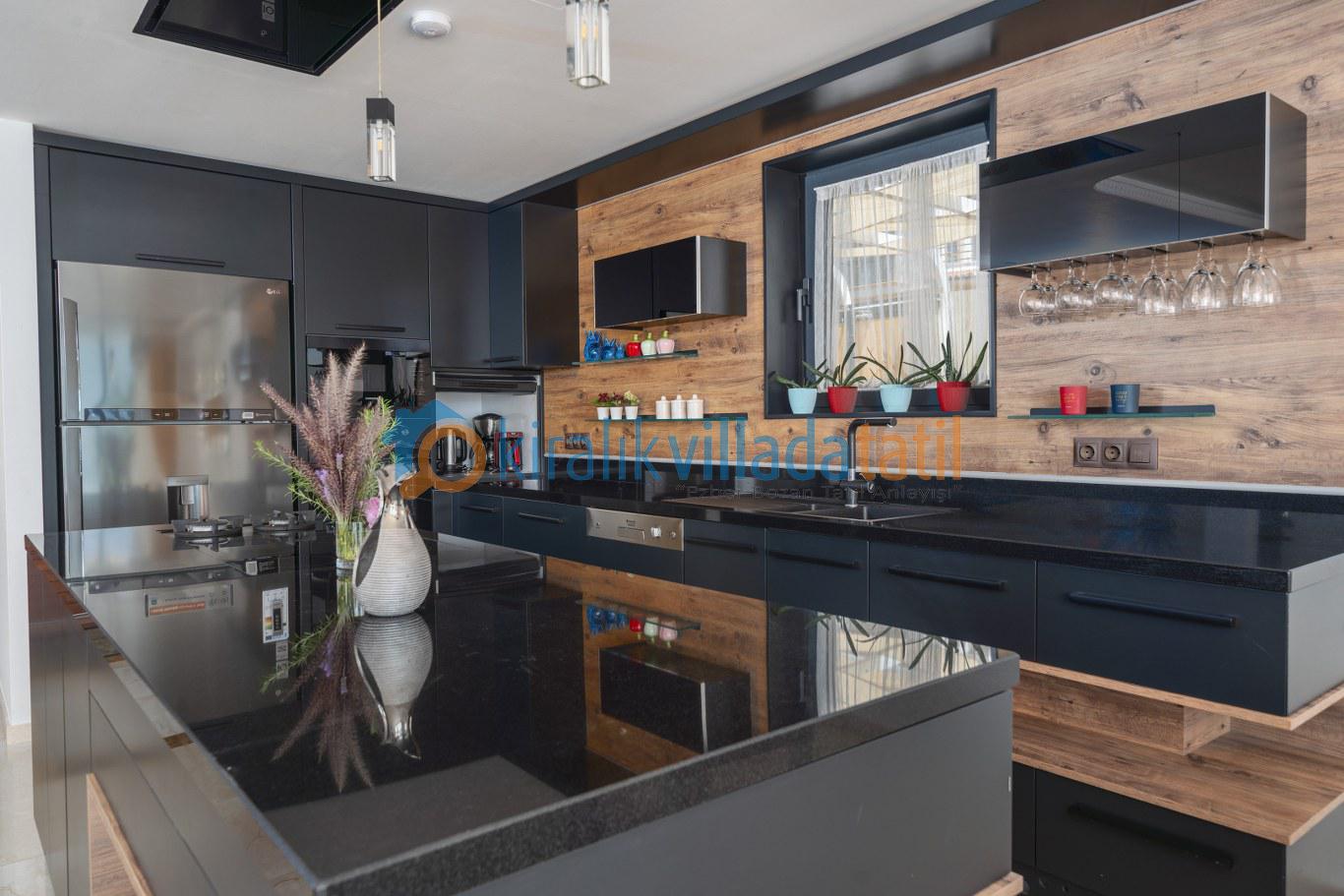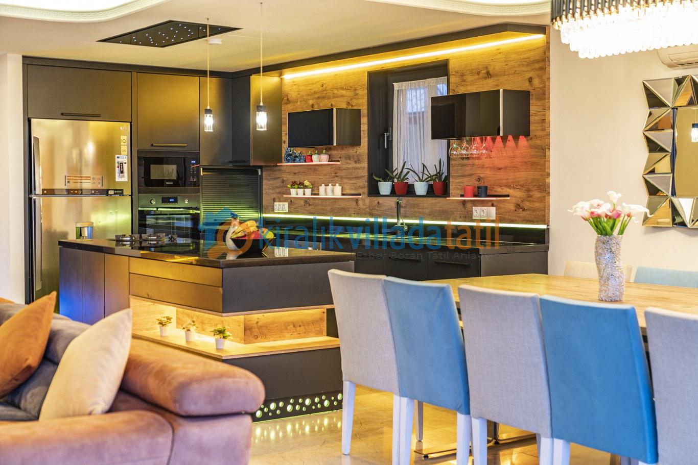 İç mekânda ise tatil süresince ihtiyaç duyulabilecek tüm ev ekipmanları eksiksiz olarak yer almaktadır. Çamaşır makinesi, bulaşık makinesi, ütü, saç kurutma makinesi ve tam donanımlı mutfak sayesinde uzun süreli konaklamalarda dahi ev konforu korunur. Bu yönüyle villa, sorunsuz bir villa kiralama süreci sunar.