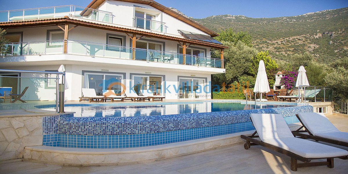 Büyük bir yüzme havuzu geniş bir havuz terası bulunan villamızın havuz terasında kalkına aydınlatan ışıklar eşliğinde yiyeceğiniz akşam yemeklerinin keyfini unutamayacaksınız. Giriş katında bulunan açık mutfak ve salon kısmınız siz misafirlerin konforu düşünülerek eksiksiz olarak hazırlanmıştır. Ana yatak odamızda bulunan jakuzi ile keyifli saatler geçirebileceksiniz Kalkan şehir merkezine yaklaşık 1.5 km mesafede olan villamız market ve restoran’lara yürüme mesafesindedir