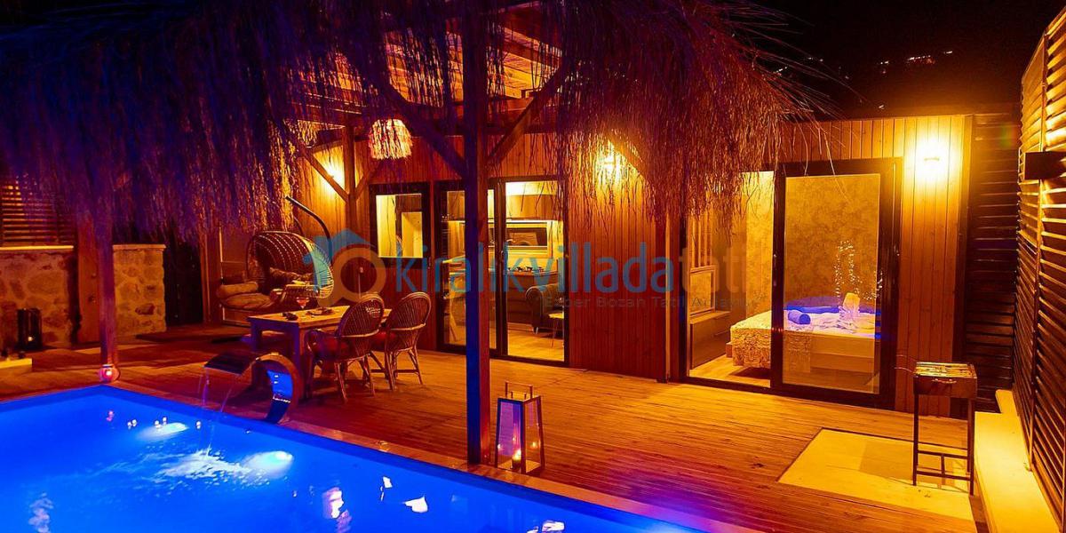 Villanın korunaklı havuz alanı dış gözlerden uzak şekilde düzenlenmiştir. Bu özelliğiyle villa, **korunaklı villa** ve muhafazakar hassasiyetlere uygun bir tatil planlayan misafirler için gönül rahatlığıyla tercih edilebilecek bir yapıya sahiptir. Yatak odasında yer alan jakuzi, balayı süresince dinlenme ve konforu ön plana çıkaran özel bir detay olarak öne çıkar. Villada ihtiyaç duyulabilecek tüm temel donanımlar mevcuttur.