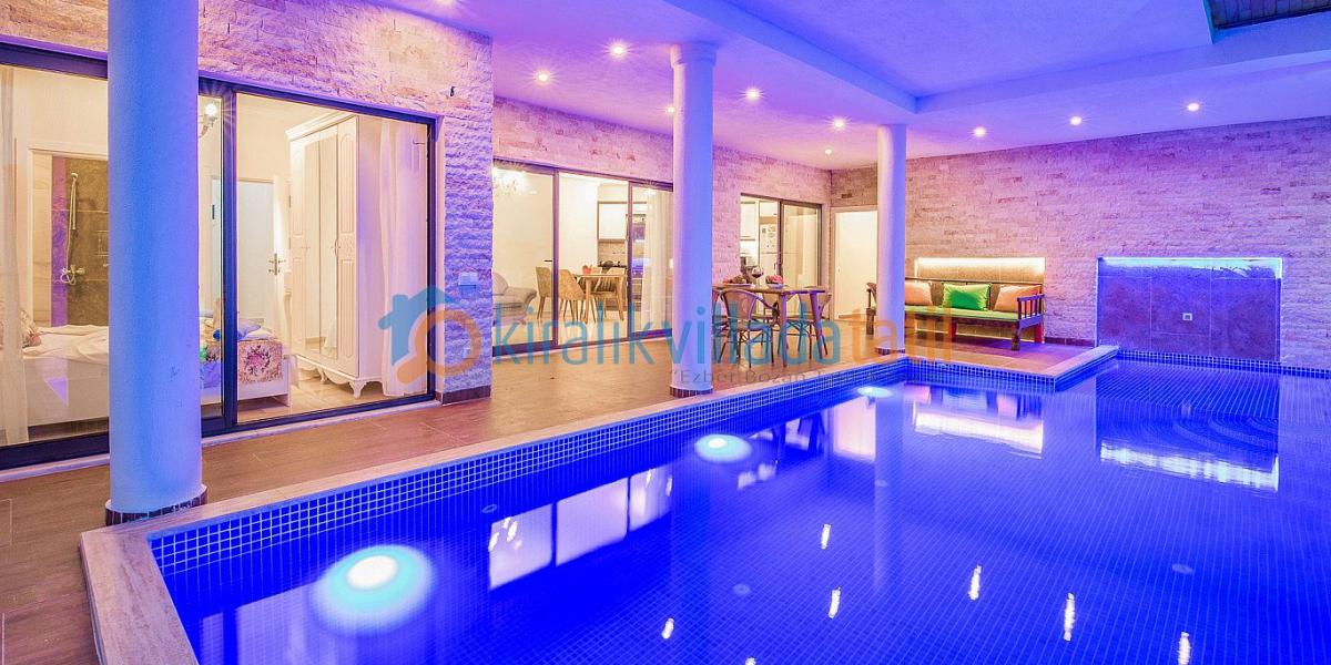 Villanın iç mekânı modern ve sade detaylarla donatılmıştır. Mutfak ekipmanları ve yaşam alanları, tatil boyunca ihtiyaç duyulabilecek tüm gereksinimleri karşılayacak şekilde düzenlenmiştir. Geniş pencerelerden içeri giren doğal ışık, deniz manzarasını iç mekâna taşıyarak ferah bir yaşam alanı oluşturur.